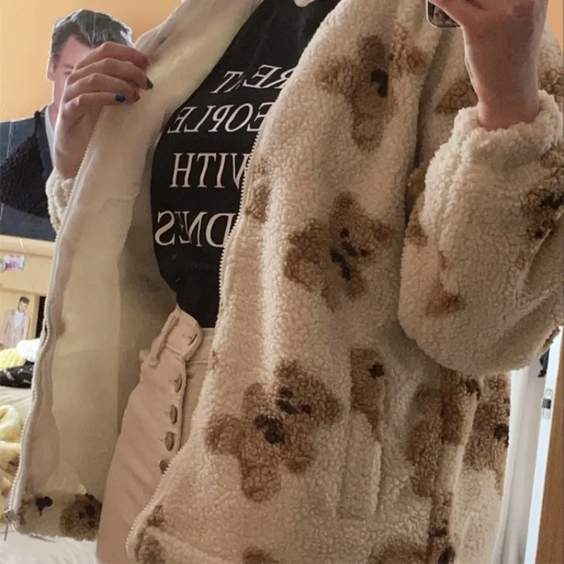 Женские зимние пальто из овечьей шерсти с мультяшным медведем 2021 ...