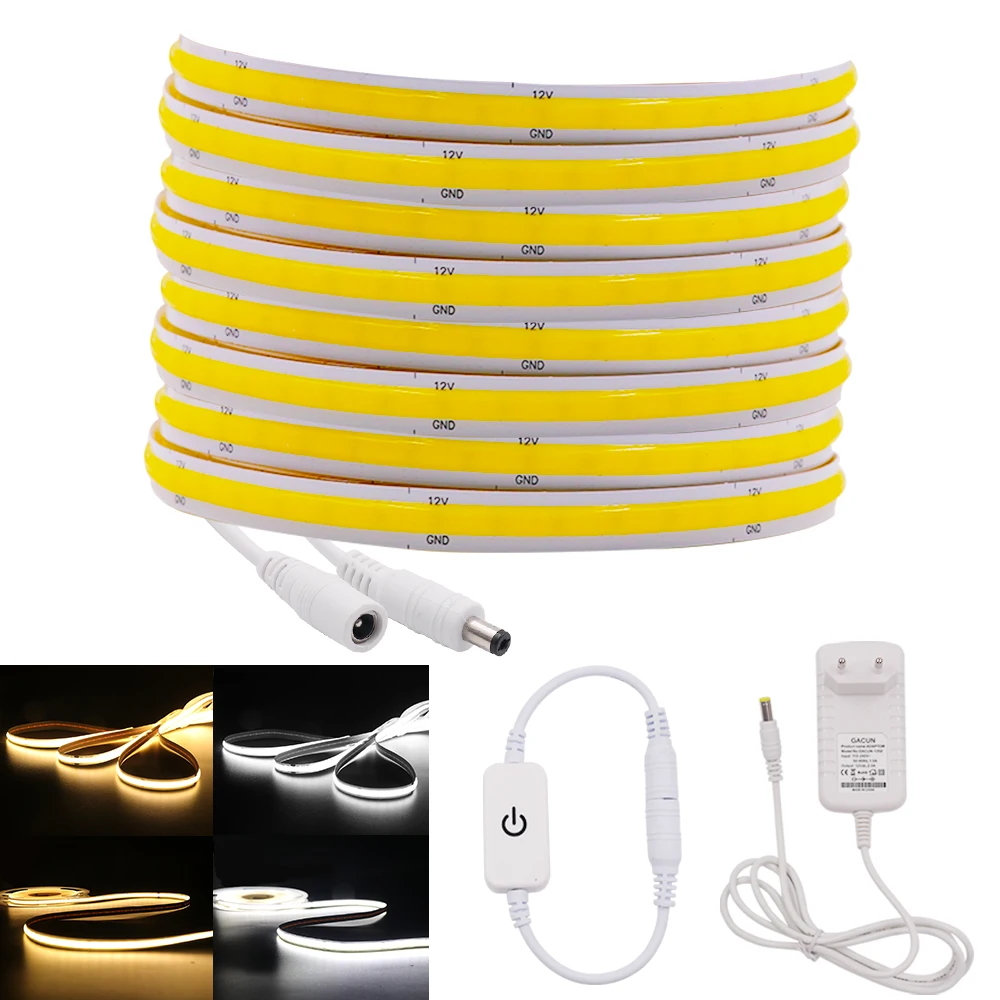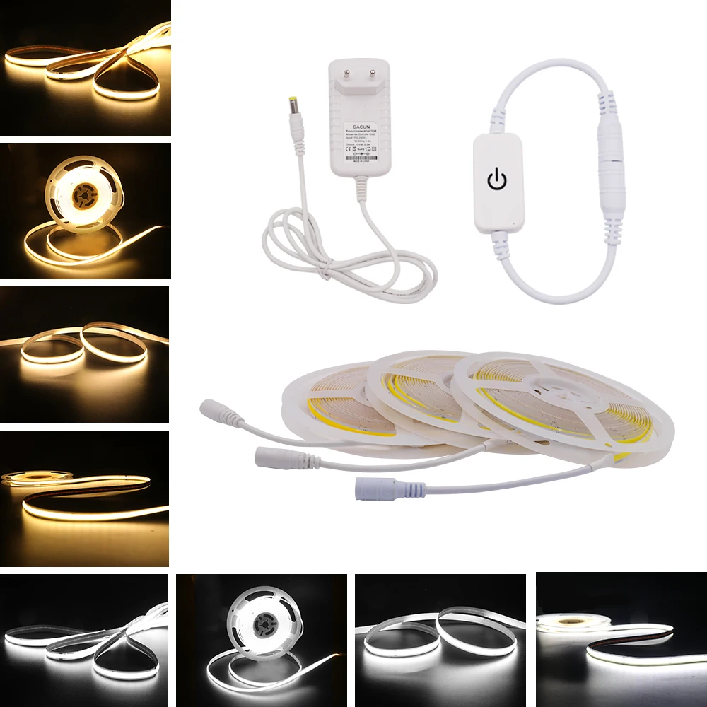 COB Светодиодные ленты с панель регулировки яркости подсветки 320 384 528 светодиоды высокой плотности гибкая светодиодная лента FOB линейный лента, 12 В, 24 В, штепсельная вилка европейского стандарта Лестницы Декор