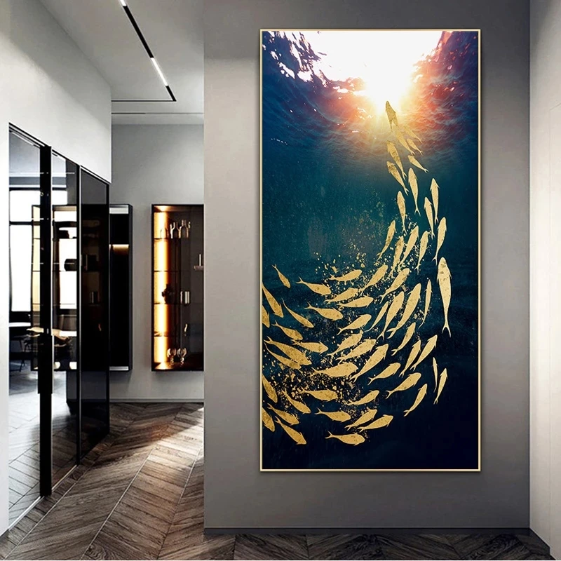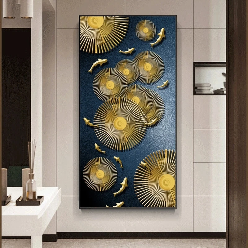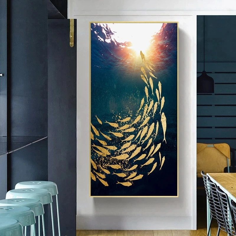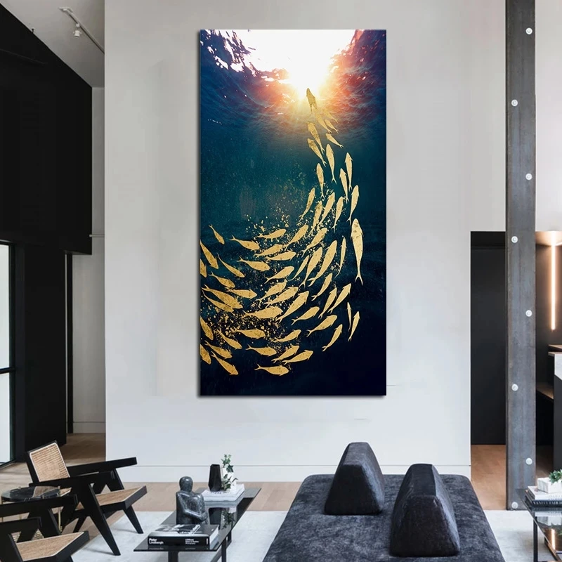 Абстрактный большой синий плакат с золотой рыбой, китайская Роскошн...