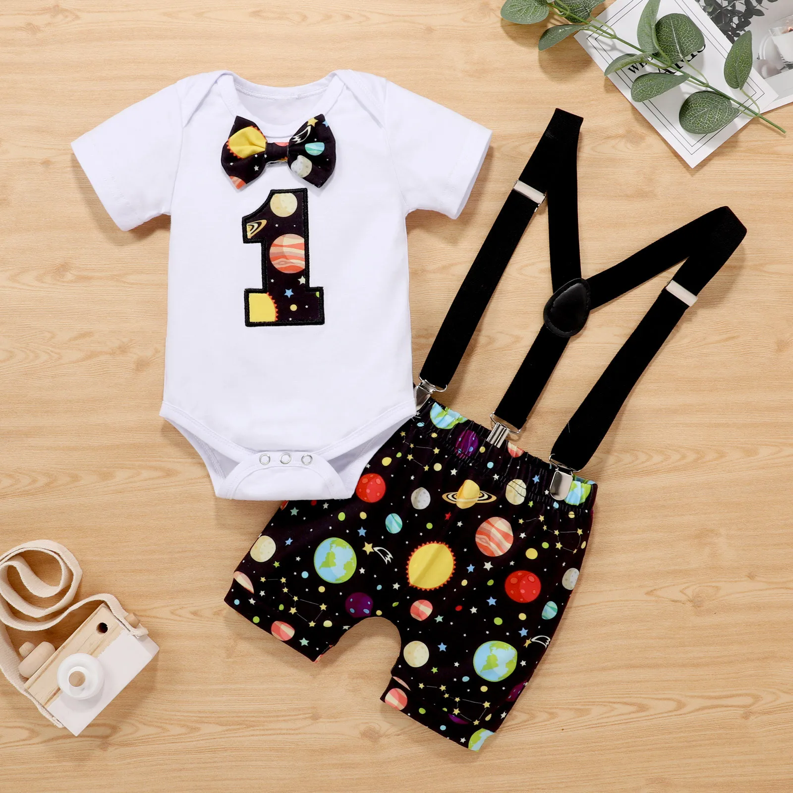 Одежда для маленьких мальчиков, первый комплект одежды, комбинезон со звездами для маленьких мальчиков и девочек + шорты с бантом на подтяжках, комплект одежды на день рождения, одежда для малышей