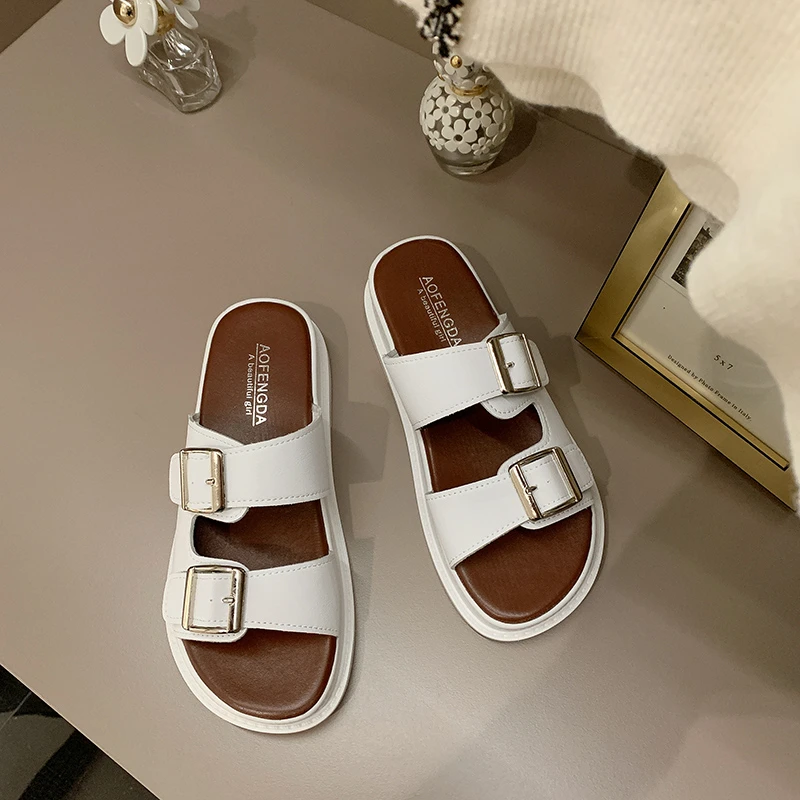 Сандалии женские кожаные с металлической пряжкой, ремешок на щиколотке, пляжные шлепанцы, низкий каблук, летняя обувь
