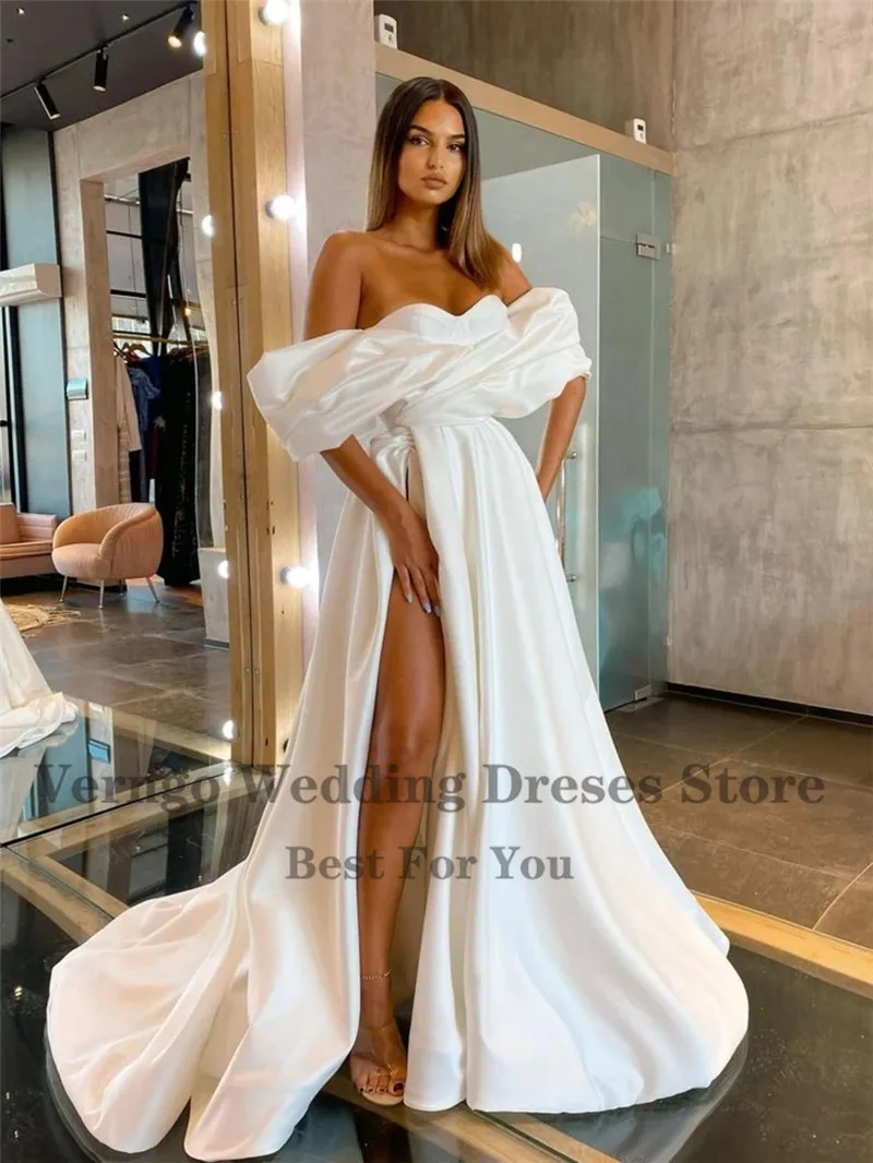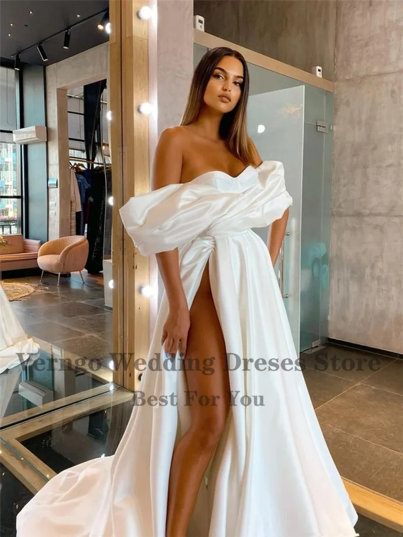 Платье свадебное длинное с открытыми плечами и высоким разрезом