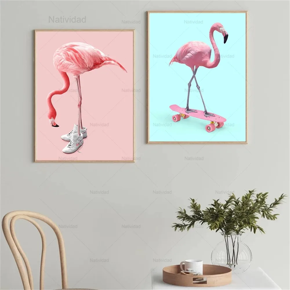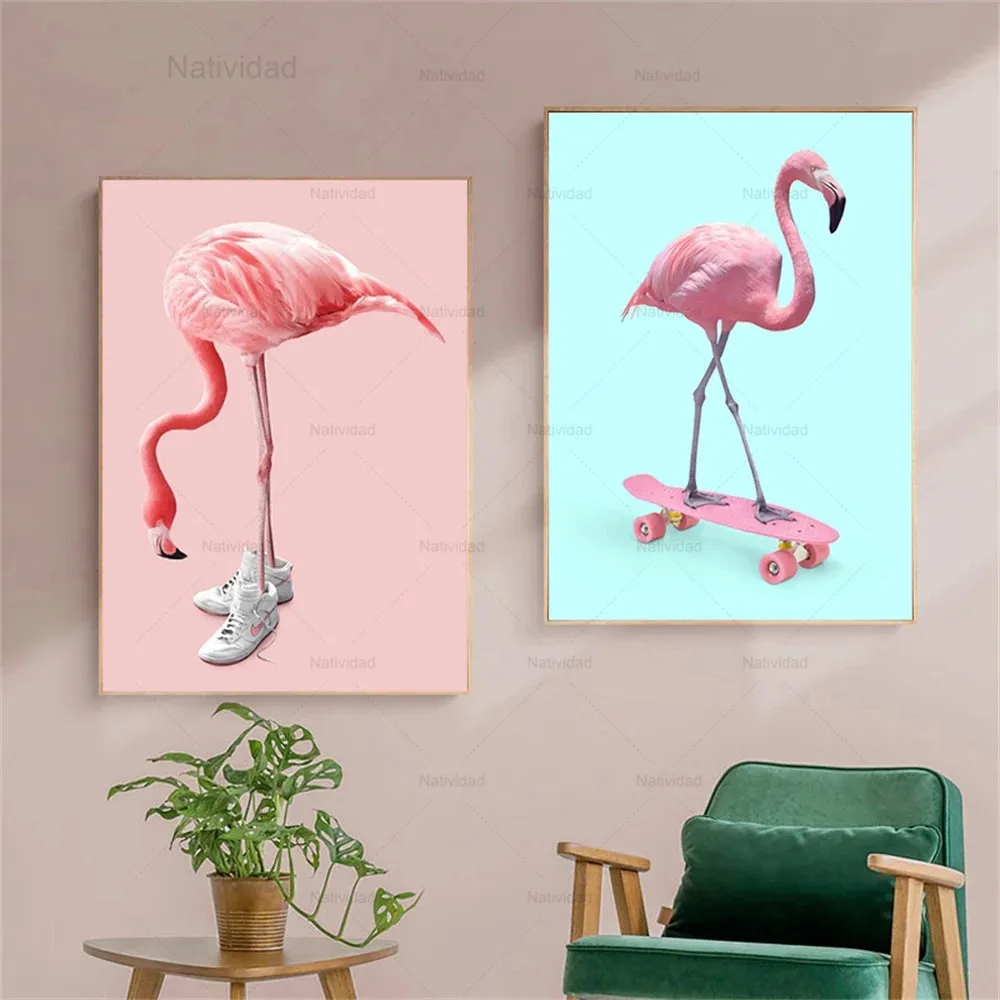 Картина на холсте, забавные животные, скейтборд, фламинго, картина с принтом, постер для гостиной, спальни, украшение для дома, настенное искусство