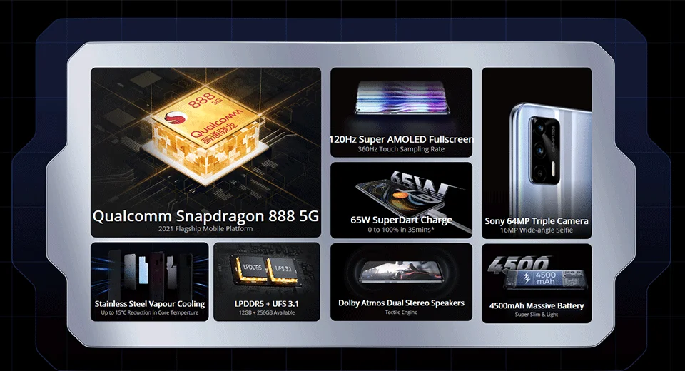 Qualcomm Snapdragon 888 5G(2021 флагманская Мобильная платформа)Супер AMOLED полноэкранный экран 120 Гц (частота дискретизации касания 360 Гц)Заряд 65 Вт SuperDart (от 0 до 100% в 35 мин *)Охлаждение паров из нержавеющей стали (снижение температуры сердечника до 15 °C)LPDDR5 + UFS 3,1 (Доступно 12 Гб + 256 ГБ)Двойные стереодинамики Dolby Atmos (тактильный двигатель)Тройная камера Sony 64MP (16-мегапиксельная широкоугольная селфи)4500 мАч массивная батарея (супер тонкий и светильник)