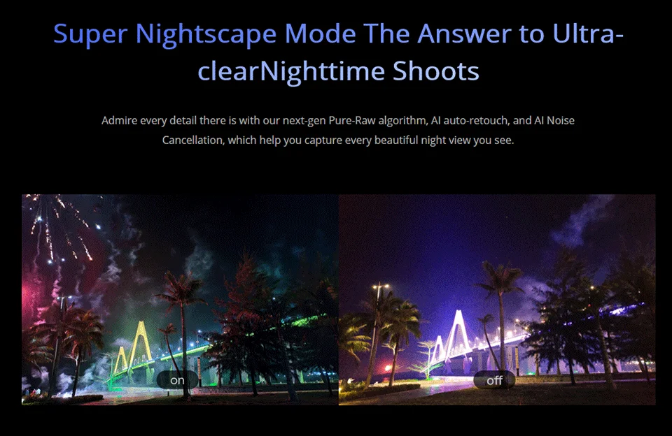 Супер режим ночного пейзажа ответ на сверхчеткие ночные съемкиВосхищайтесь каждой деталью благодаря нашему чистому алгоритму следующего поколения, автоматическому ретушированию AI и подавлению шума AI, которые помогут вам запечатлеть каждый красивый ночной вид, который вы видите.