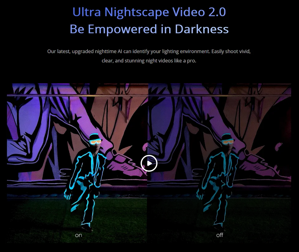 Ultra Nightscape Video 2,0 можно использовать в темнотеНаша последняя обновленная Ночная AI может определить вашу среду освещения. Легко снимайте vivid, четкие и потрясающие ночные видео, как профессионал.