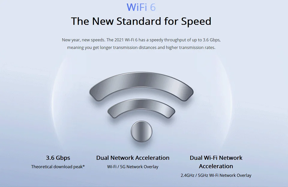 WiFi 6, новый стандарт скоростиНовый год, новые скорости. 2021 Wi-Fi 6 имеет быстрый пропускной способностью до 3,6 Гбит/с, что означает, что вы можете больше дальности передачи и более высокую скорость передачи.3,6 Гбит/с (теоретическая загрузка пик *)Двойное сетевое ускорение (Wi-Fi / 5G сетевая накладка)Двойной сети Wi-Fi ускорения (2,4 ГГц/5 ГГц Wi-Fi сети верхнего слоя)