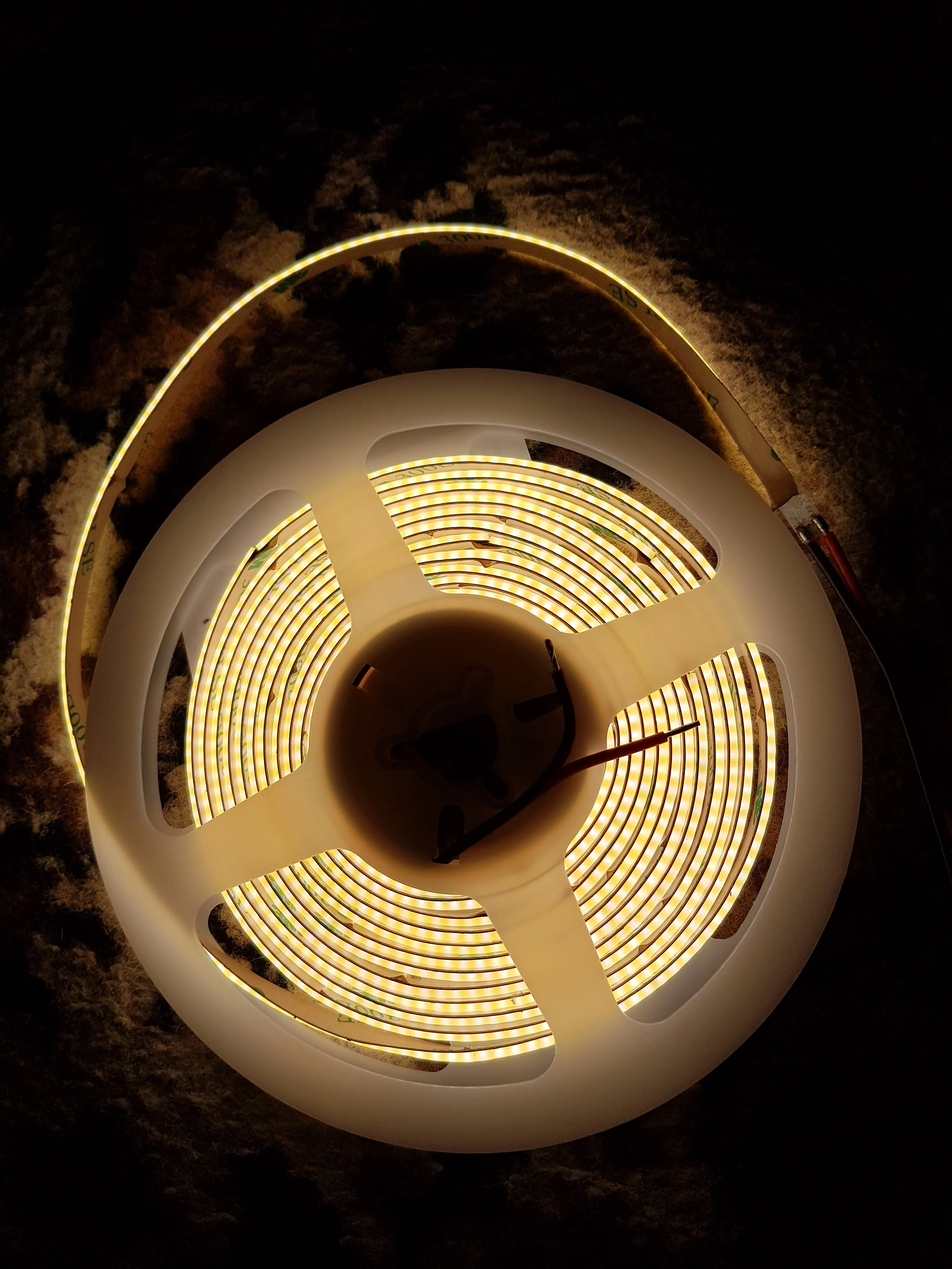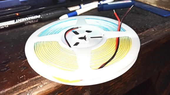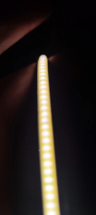 Узкая и тонкая полоска - светит отлично,ярко.Брал тёплый белый цвет. Режется кратно разметке.Её плохо видно,но если оторвать бумажку над клеевым слоем - всё видно.Товар отличный,продавца рекомендую!