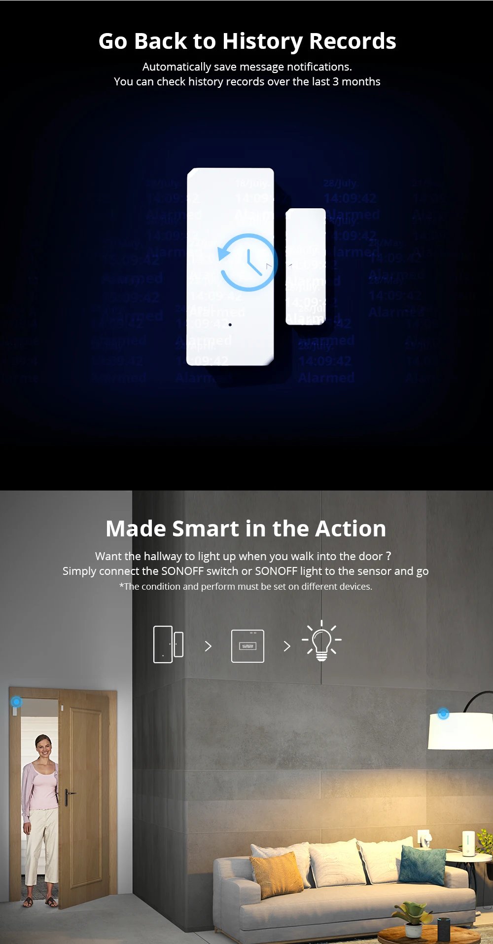 Что еще более важно, Датчик позволяет добавить камеру безопасности или старый смартфон для просмотра, кто входит в ваш дом, предоставляя вам более подробную информацию и примечания о неприглашенных гостях. Можете отправить оповещение о состоянии открытия двери/окна в приложение, которое дает вам душевное спокойствие, когда вы не дома. Проверка истории может быть отслежена до последних 3 месяцев, и это может помочь вам посмотреть назад и проверить состояние вашего дома в то время. Свет срабатывает в действии. Вы можете установить связь в умной сцене приложения eWeLink, чтобы подключить датчик и ваш светильник, чтобы вы могли открыть дверь, чтобы включить и выключить светильник прихожей. Мост SONOFF необходим для того, чтобы сделать эту связь возможной. В сочетании с сервисом IFTTT датчик может использоваться для запуска большего количества устройств или процедур. Эта функция «совместного использования устройств» предназначена для того, чтобы дать больше вашей семье знать, что ваш дом безопасен. После обмена сенсором, все общие пользователи получат оповещение о состоянии, когда кто-то откроет дверь. Датчик клейкую ленту 3м установлен, легко двигаться и снимается. Он может работать просто хорошо вверх дном и боком, пока магнит находится менее 5 мм от датчика, что не влияет на расположение датчика. Он работает от аккумулятора и имеет низкое энергопотребление, что обеспечивает Срок службы батареи может длиться до 2 лет.