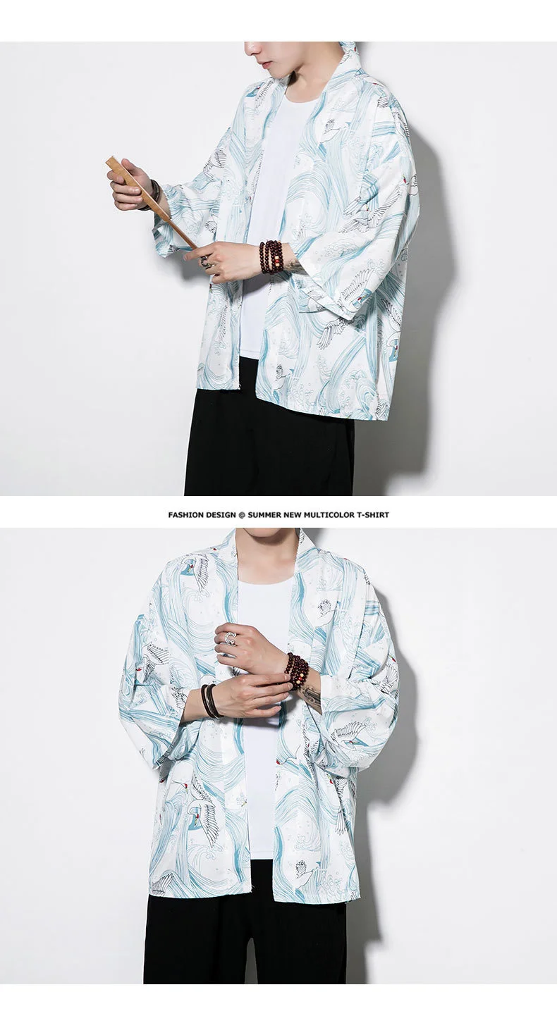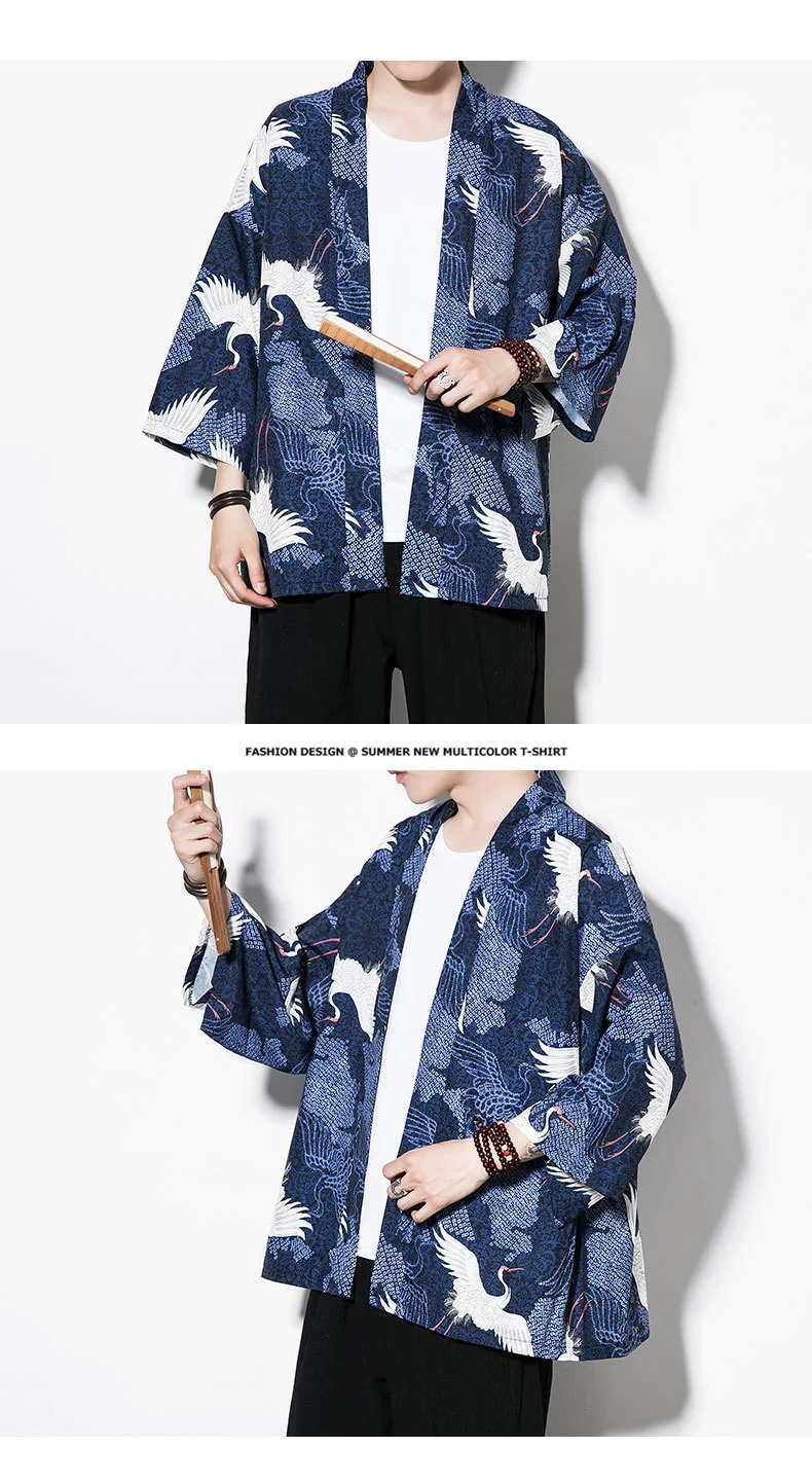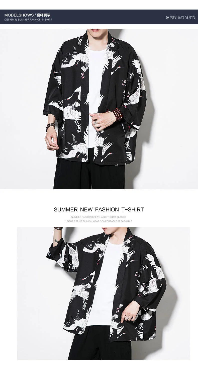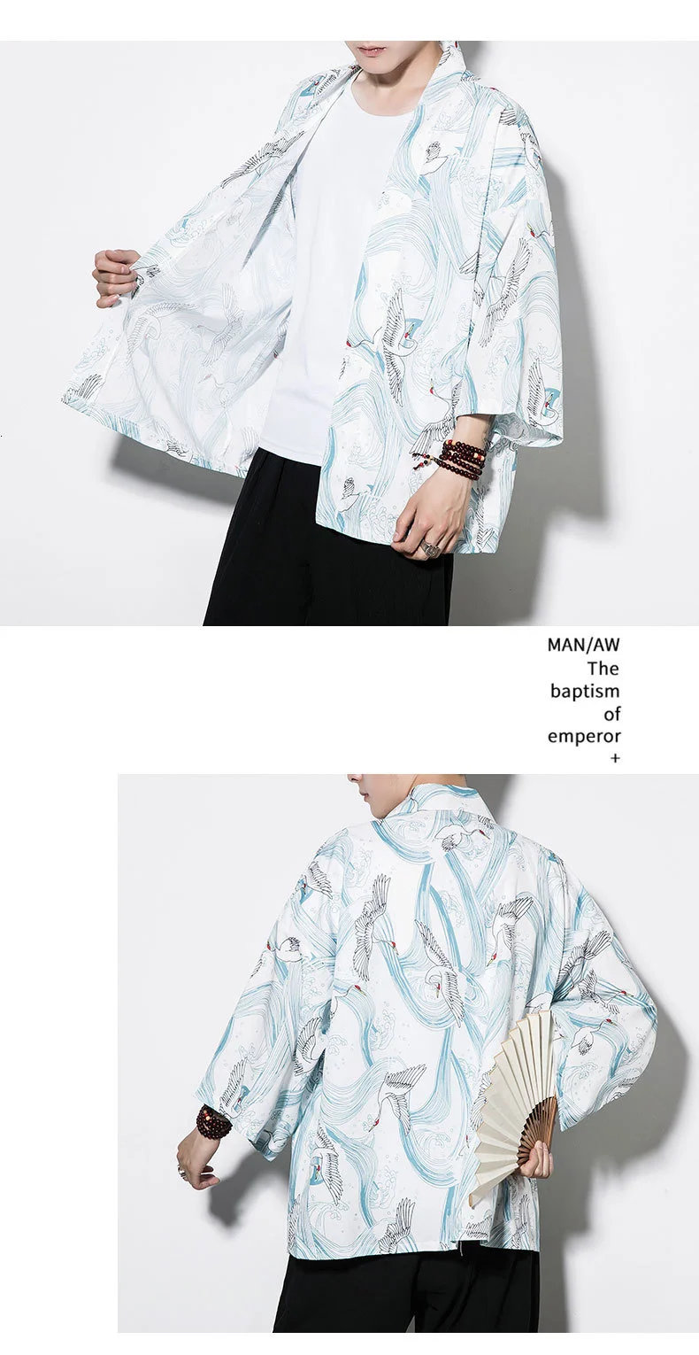 Летние мужские рубашки-кимоно MrGB из ледяного шелка, кардиган с короткими рукавами, Солнцезащитный кардиган с графическим принтом журавлей, мужская одежда большого размера в китайском стиле