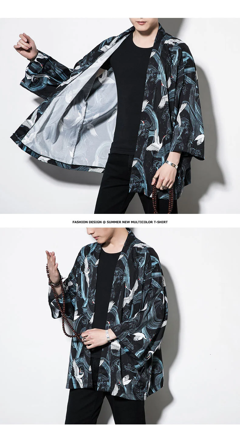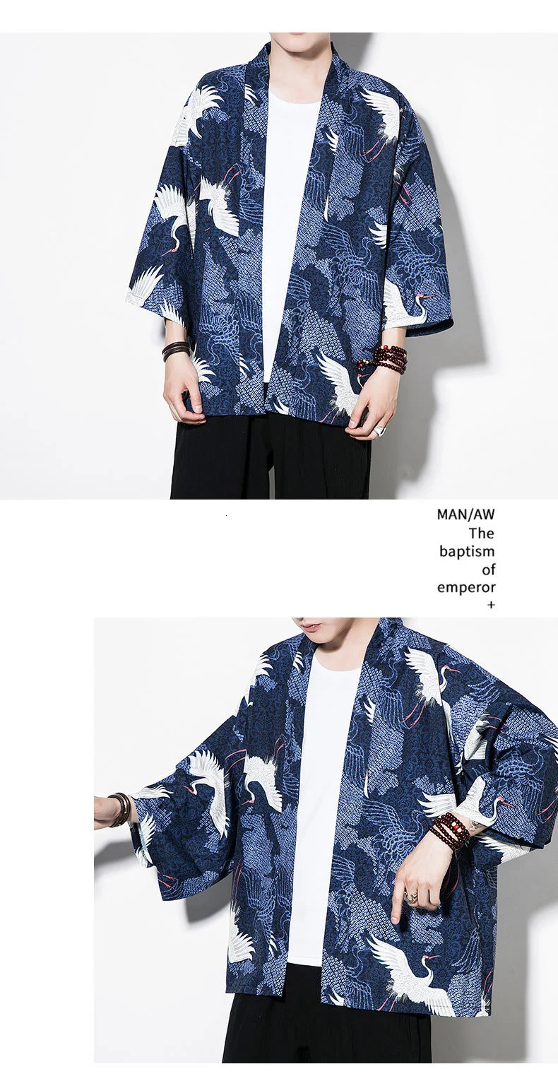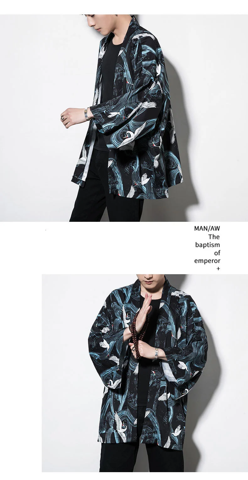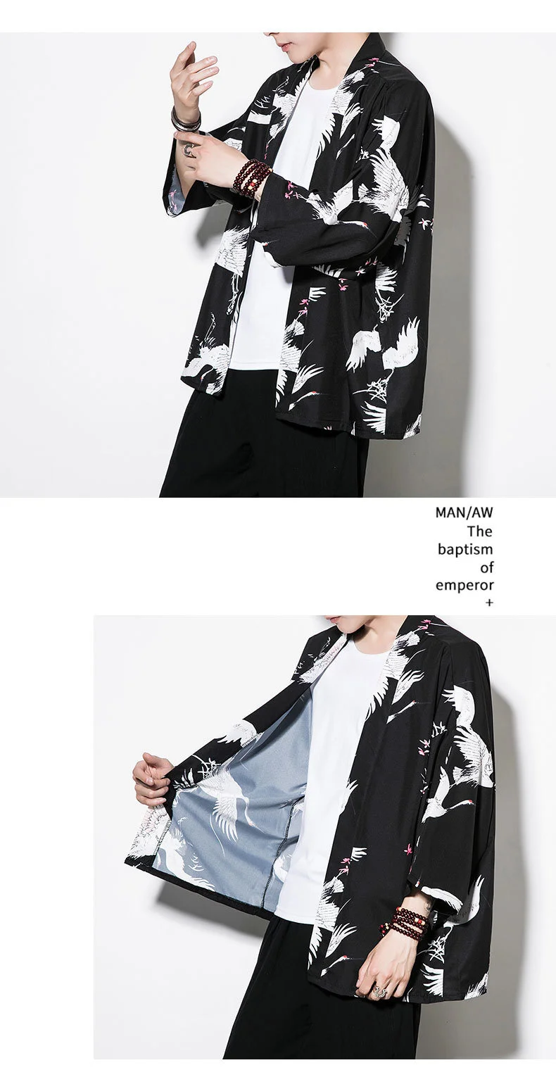 Летние мужские рубашки-кимоно MrGB из ледяного шелка, кардиган с короткими рукавами, Солнцезащитный кардиган с графическим принтом журавлей, мужская одежда большого размера в китайском стиле