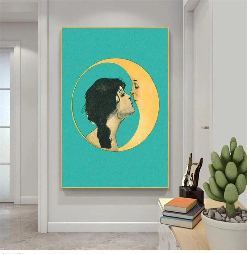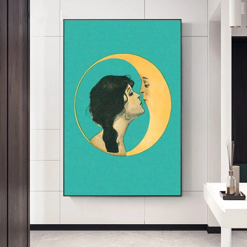 Современный стиль девушка целуи Луна холст печать на Луне Арт Деко антикварная Луна лицо настенные художественные плакаты картина холст украшение для дома