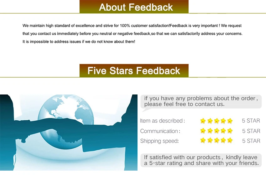 1. Пожалуйста, укажите правильный адрес доставки и контактную информацию, вы знаете, курьерская компания возвратит посылка после того, как попробовала доставить два раза. Если это происходит, и покупатель запрашивает у нас повторно отправить посылку, покупатель должен нести ответственность за все возврат и повторную отправку. Спасибо за понимание и внимание.