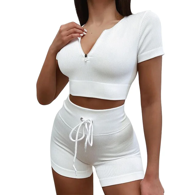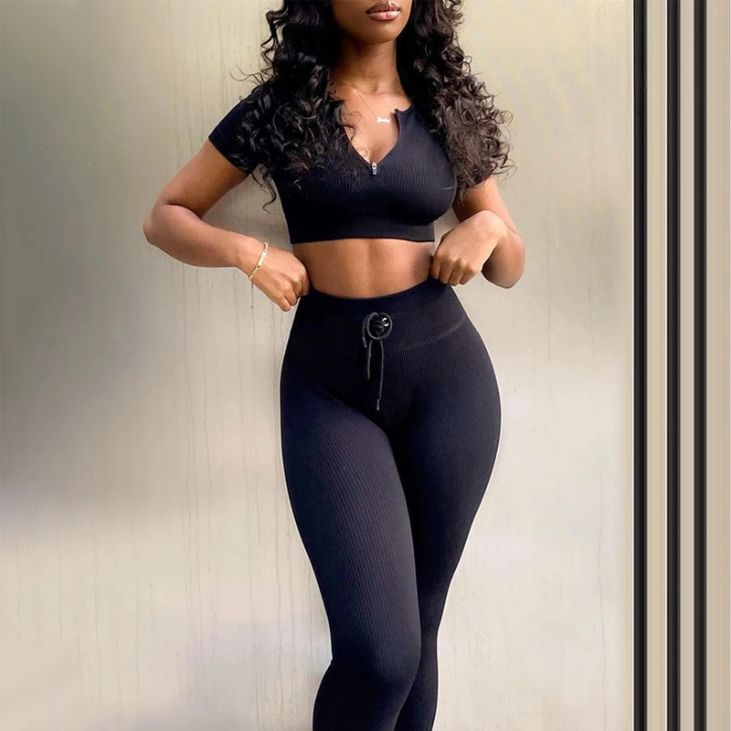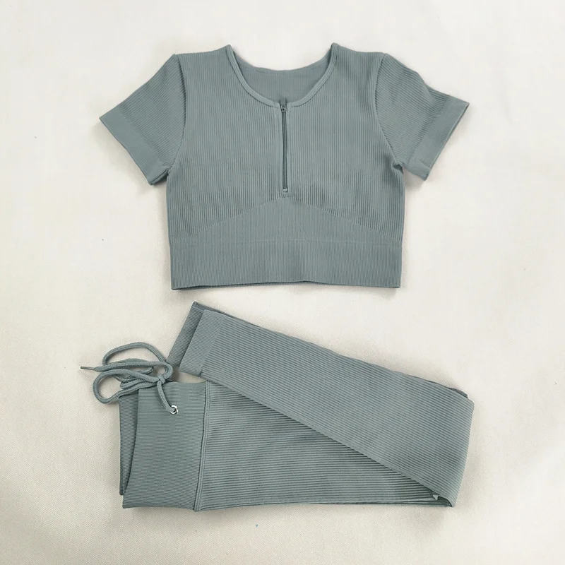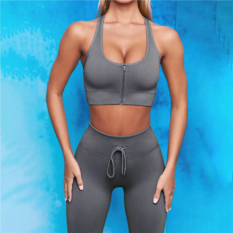 Комплект Спортивный женский из двух предметов, бесшовный укороченный топ на молнии, рубашка и леггинсы с кулиской, спортивный костюм, наряд для тренировок, йоги, тренажерного зала