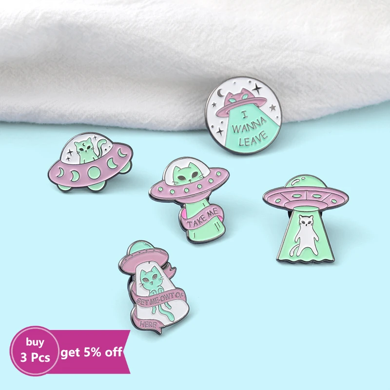 Эмалированные булавки Escape her с инопланетянином котом, забавная брошь в форме НЛО, значок на лацкан, мультяшная научная фантастика, ювелирные изделия, подарок для детей, друзей, оптовая продажа