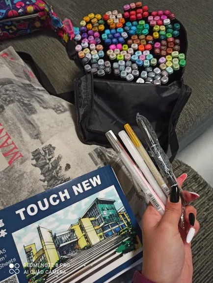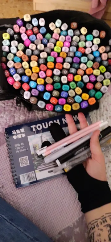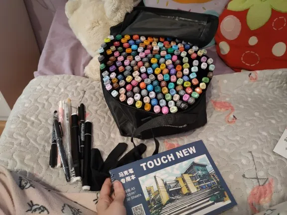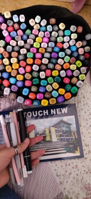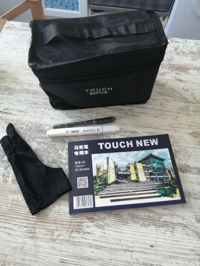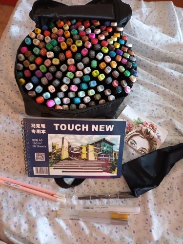 СУПЕР, спасибо за прекрасные маркеры сумка была от touch new и сами маркеры тоже. один маркер еле как пишет , но их 168 так что не очень критично. Все подарки прям очень классные. (положили даже серебристую и золотую ручку) . Альбом от touch new принципе нормальный, но надо рисовать всегда с подложкой чтобы маркеры не просачивались. А так доставка очень быстрая 2 дня и все, курьером доставка. СПАСИБО БОЛЬШОЕ!!!!!