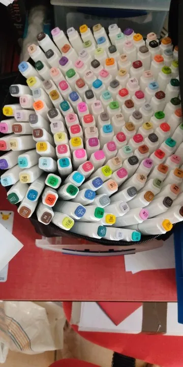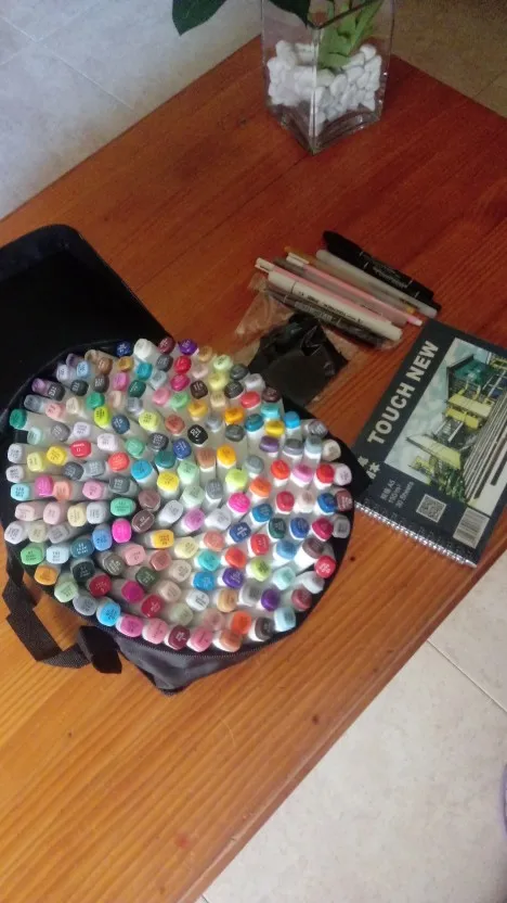 Estaba todo genial,los 168 rotuladores más los regalos,pero claro,me vino el color 36,el color crema sin punta y un color turquesa sequisimo por ambos lados,luego encima casi todos los fluorescentes estaban igual de secos y un azul marino venia con demasiada tinta,por otro lado habia un marron que lo abrí y me salió disparada la tinta por todos lados haciendo que todo se pringara hasta yo misma. Me gustaría que revisaran los colores al menos una vez antes de enviarlos,ya que cuestan carillos. Pero e de decir que son los mejores rotuladores que nunca e tenido,me los volveria a pedir de todas formas incluso.