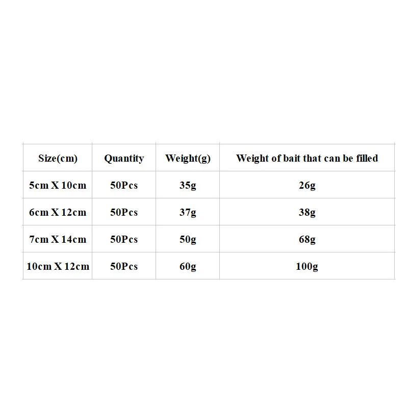 5 см * 10 см: 26 г Вес рыболовной приманки, которая может быть заполнена 6 см * 12 см: 38 г Вес рыболовной приманки, которая может быть заполнена 7 см * 14 см: 68 г Вес рыболовной приманки, которая может быть заполнена 10 см * 12 см: 100 г Вес рыболовной приманки, которая может быть заполнена
