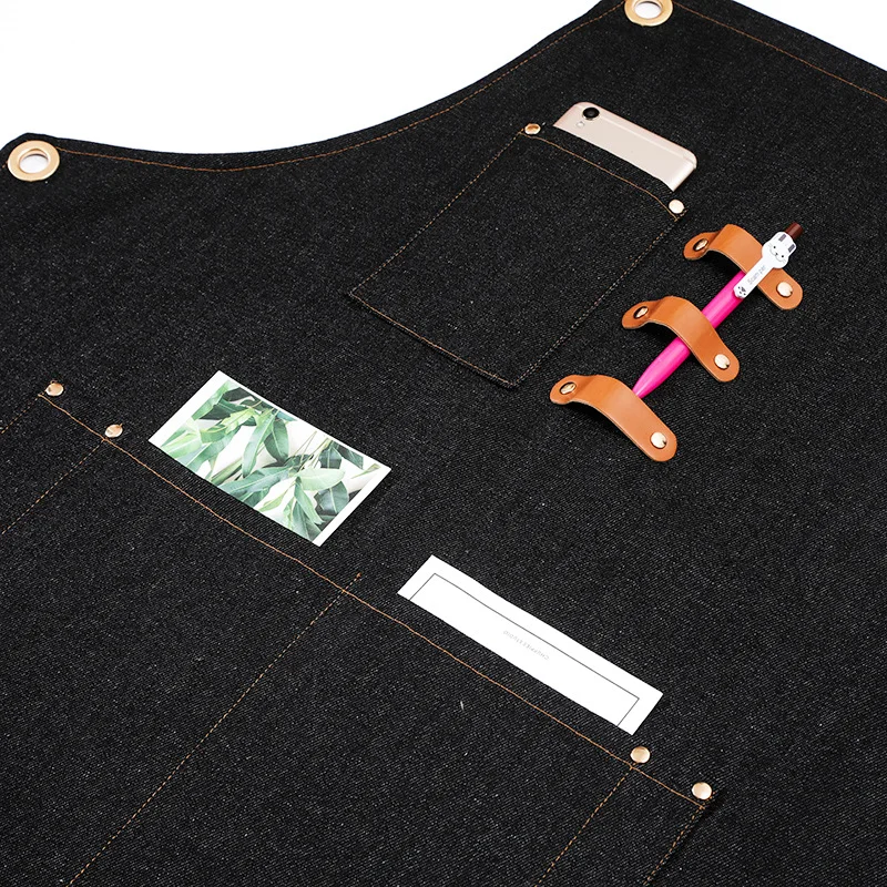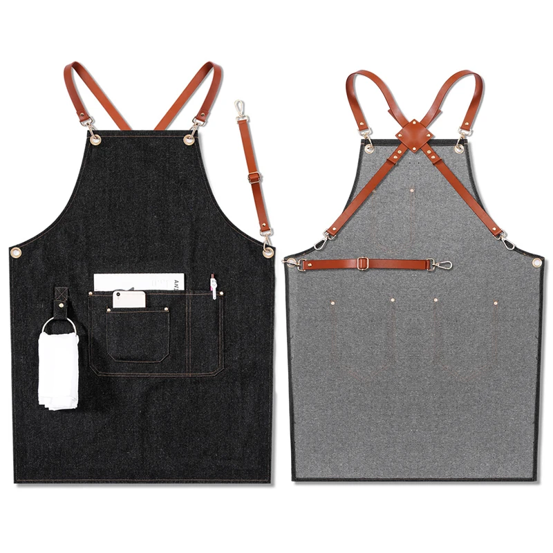 Комбинезон из натуральной синей джинсовой кожи с множеством карманов, наплечный ремень, без рукавов, фартук для магазина кофе, молока, чая