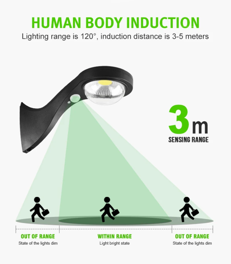 2. Индукция человека + светильник управления: автоматически Включите светильник в ночное время и выключите светильник в дневное время. Диапазон освещения 120 °, Индукционное расстояние 3-5 метров.