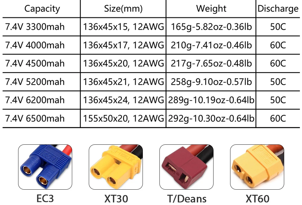 2S 7,4 V 4000 мА/ч, 60C 136*45*17 мм, 12AWG 210g-7.41oz-0.46lb