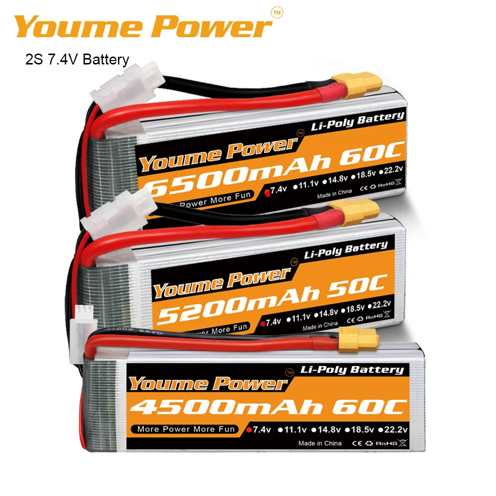 Литий-полимерный аккумулятор Youme 2S, 7,4 В, 3300 мАч, 5200 мАч, 6200 мАч, батарея для дрона 50C с разъемом XT60 T для радиоуправляемого автомобиля, грузовика, лодки, вертолета