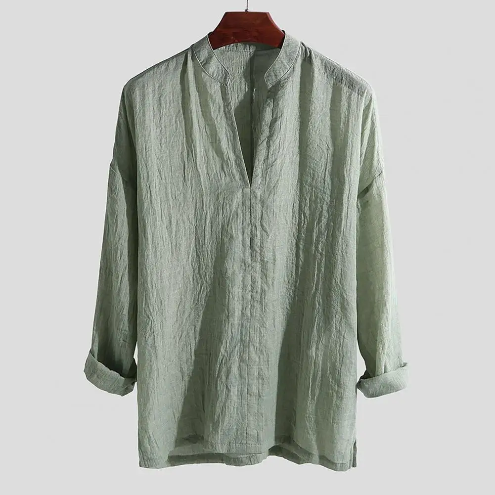 Мужская модная однотонная дышащая рубашка с воротником-стойкой, льняная блузка для офиса, мужская повседневная футболка, блуза, стрейч