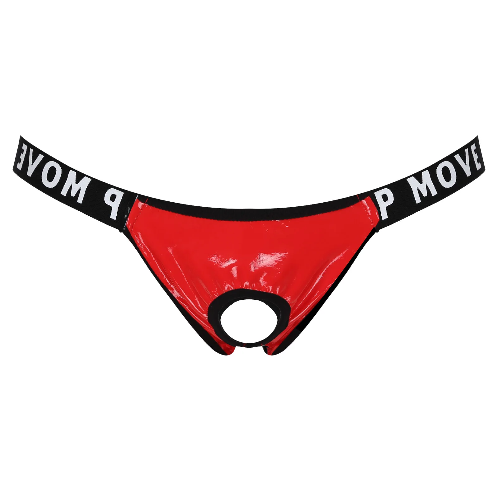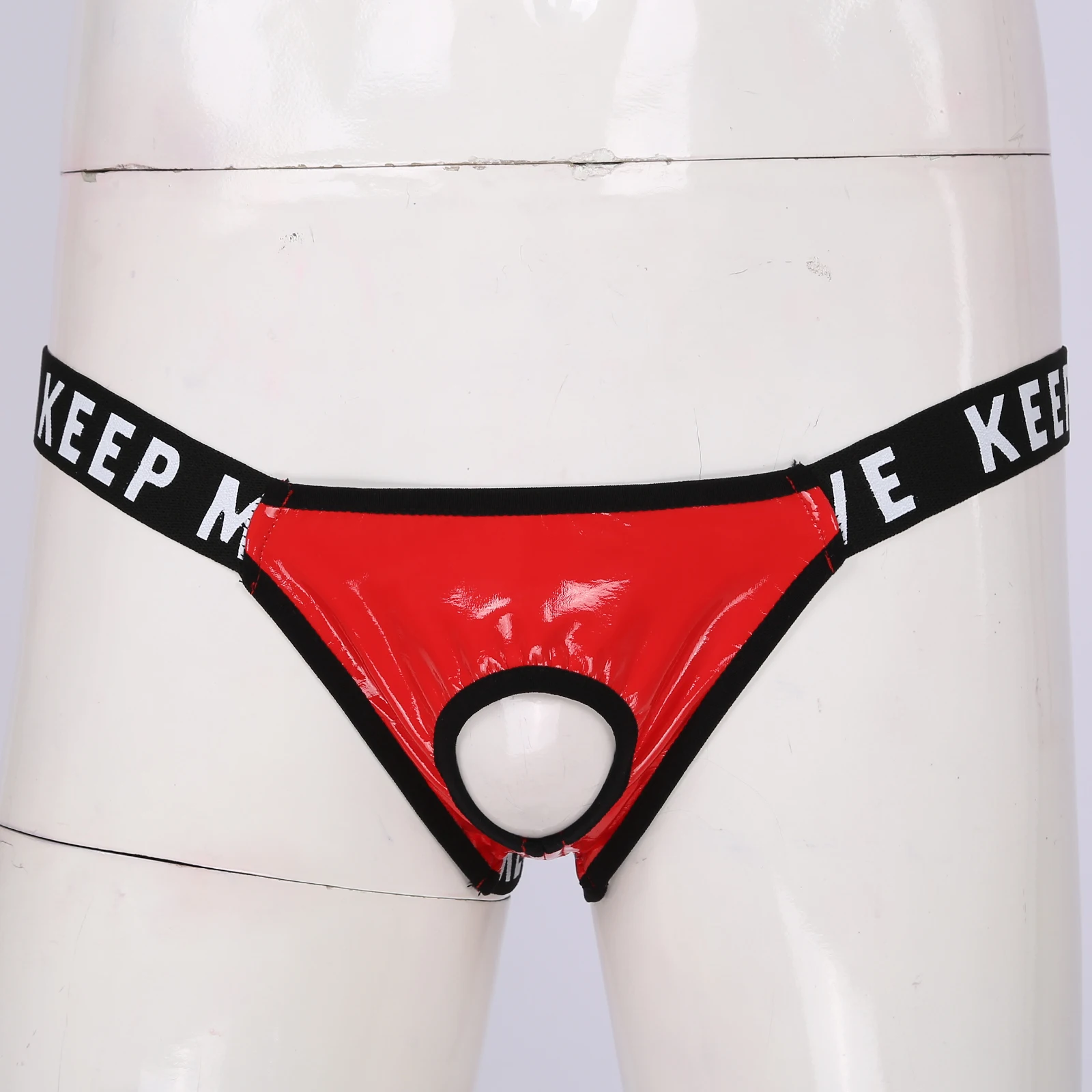 Для мужчин кожаное нижнее белье выдалбливают Лакированная кожа выпуклость мешок трусы Ракушки Т-образные с буквенным принтом, платья с поясом и рисунками стринги