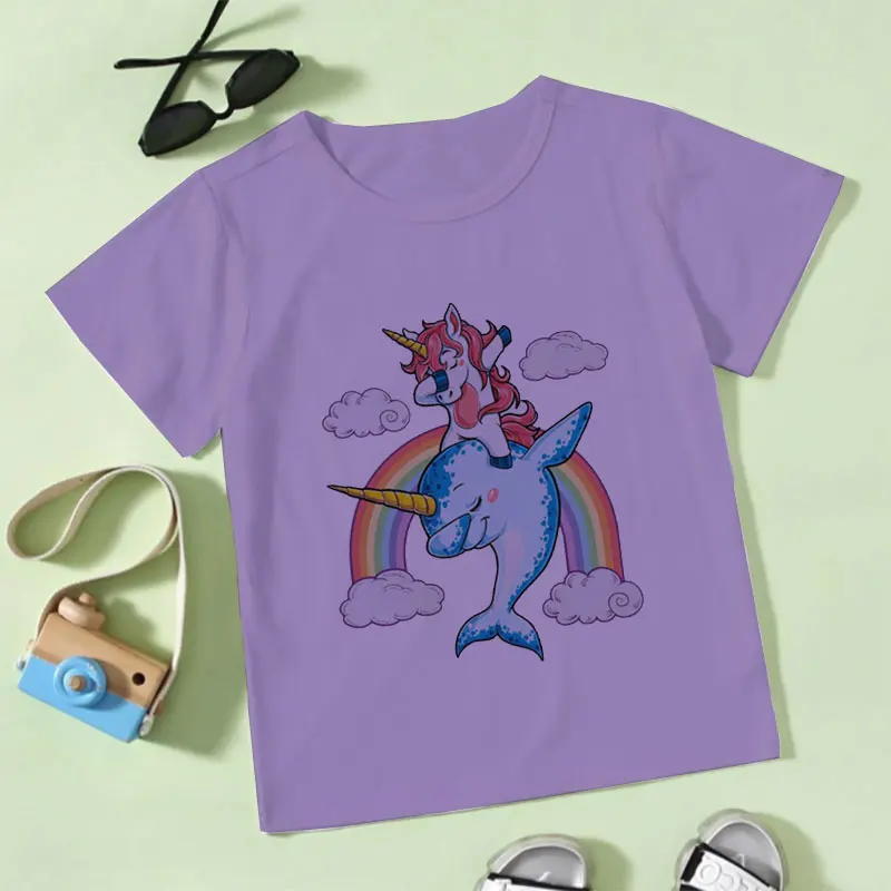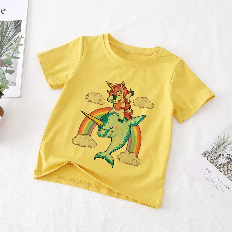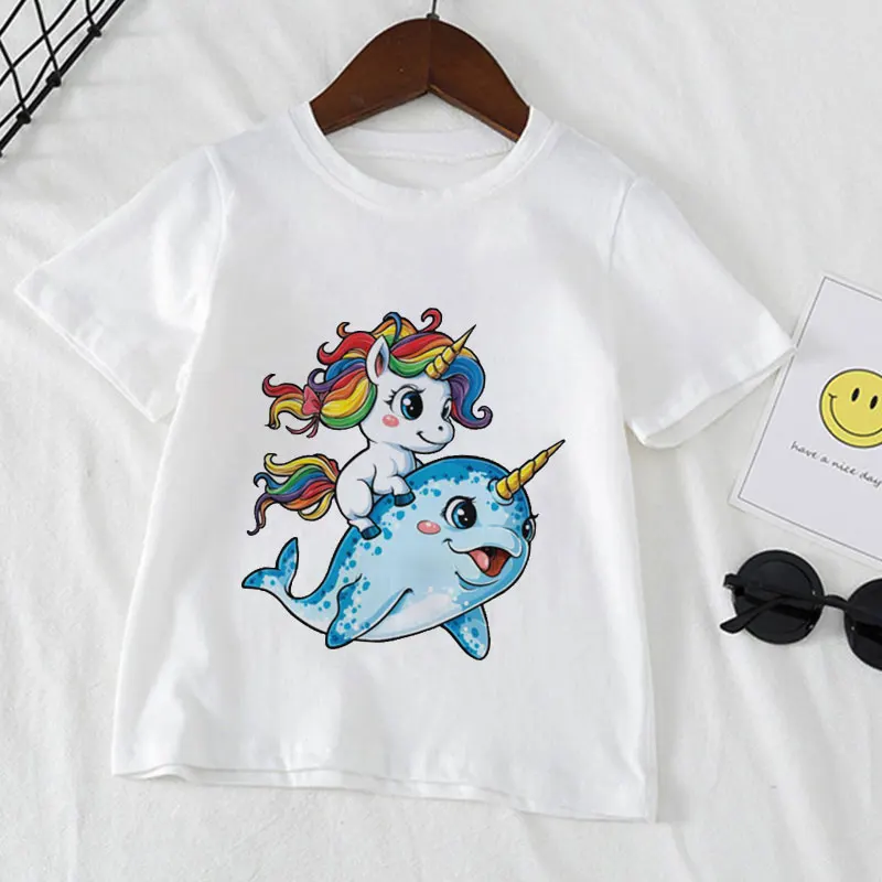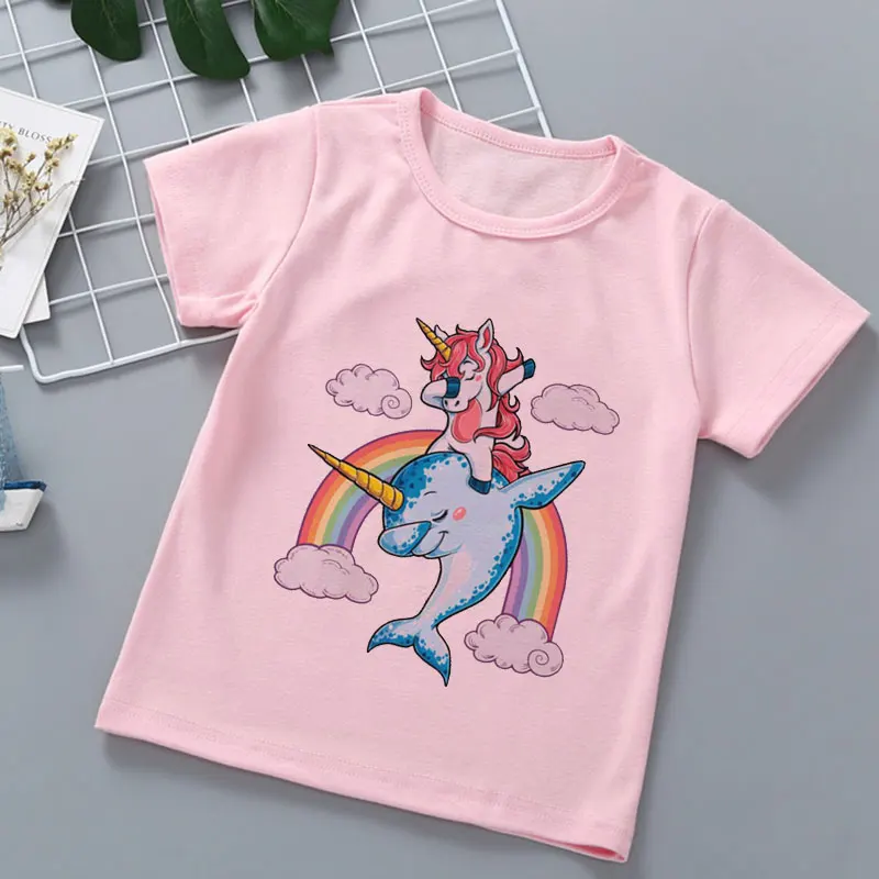 От 2 до 9 лет, новинка, летнее платье с героями мультфильмов с принтом Единорог, Футболка розового и белого цвета в стиле Харадзюку Стиль Детская футболка с короткими рукавами и с круглым вырезом