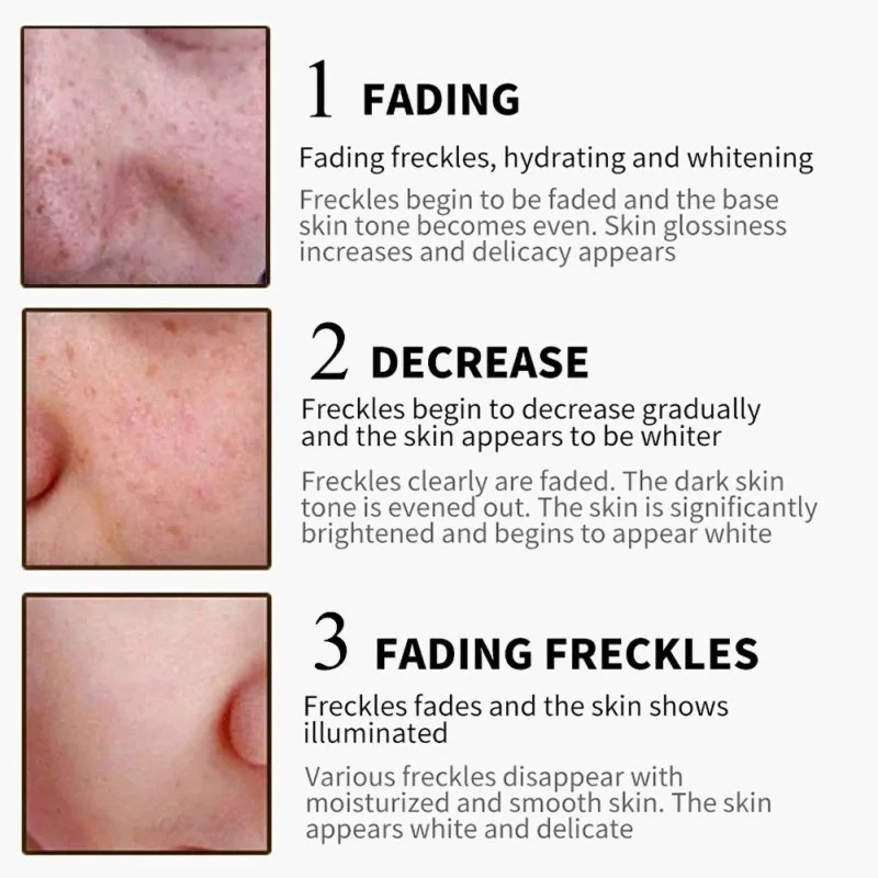 Название продукта: крем для отбеливания веснушекСостав:Ниацинамид, бисаболол, капрический триглицеридОсобенности:Этот продукт изготовлен из натуральной биологической эссенции, извлекаемой из высокотехнологичных, с коротким отбеливание веснушек, удаление акне особенно сильный эффект длительного использования может регулировать регенерацию и Ремонт клеток кожи, устранение стимулов для производства меланина, эффективная профилактика регенерации различных типов пятен, достижение гладкой и нежной кожи, Эффективность мягкого отбеливания.Эффективность:Глубокое отбеливание кожи и увлажнение темных пятенПопрощайтесь с упрямыми пятнами Сарка, возрастными пятнами, веснушками, гиперпигментацией и мелсамойКак использовать:После очищения и тонизирования нанесите правильное количество на лицо и мягко массируйте до впитывания. Вы также можете нанести слой в качестве маски для сна.