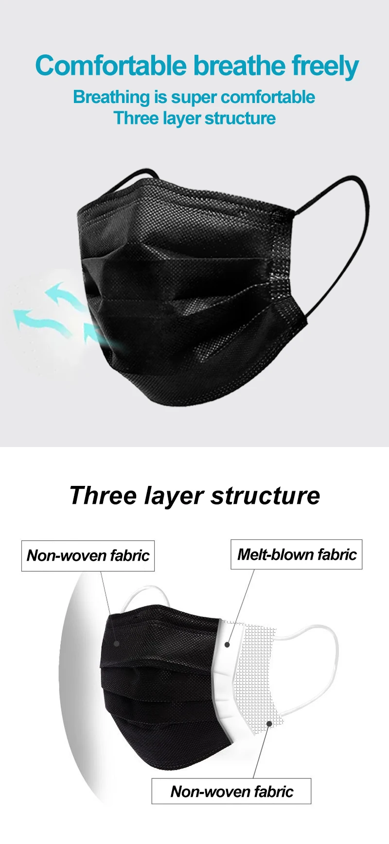 Одноразовая маска гражданского 3-х слойные ежедневная маскаПараметры продукта:Материал: трехслойный нетканый материалПодходящий сезон: Весна, Осень, Зима, ЛетоЦвет: черныйСтиль маски: тип ушной петлиРазмеры: около 17*9,5 смОсобенности продукта:1. Новая ткань PP Нетканая ткань, мягкая и чистая, удобная и дышащая2. Процесс бесшовной вязки3. Три раза дизайн, больше дышащего пространства на лице4. Пластиковая полоска для носа, алюминиево-пластиковая полоска для носа,5. Многослойная защита для вашего дыхательного здоровьяКак носить маску:1. Закройте рот и нос и Повесьте два боковых ремня на уши2. Фиксация моста носа в соответствии с формой носа предотвращает загрязнения воздуха от входа.3. Пожалуйста, потяните маску к нижней челюсти, чтобы немедленно предоставить трехмерное дышащее пространство.Пожалуйста, обратите внимание, что указанный Товар производится и распространяется за рубежом и в соответствии с законодательством страны его происхождения