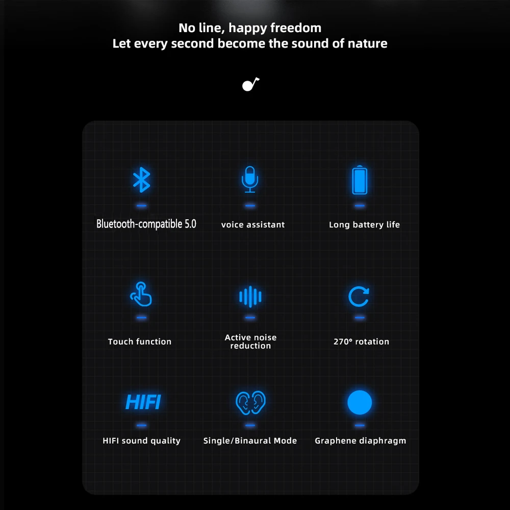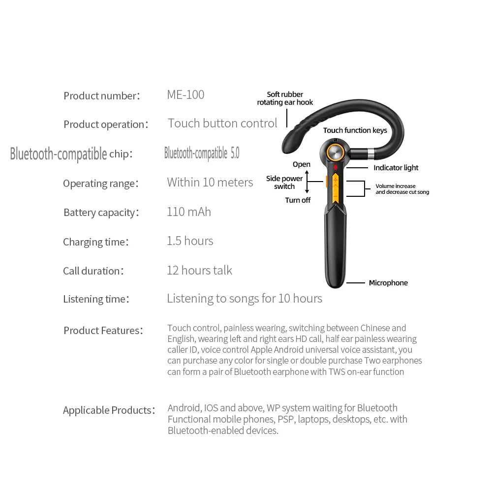 Параметр:1. Bluetooth-совместимая версия: двухрежимный Bluetooth-совместимый V5.0 ультра-низкое энергопотребление2. Поддерживающее соглашение: A2DP 1,3/HFP1.6/HSP1.2/AVRCP1.6/D11.33. Bluetooth-совместимый Диапазон частот: 24 ГГц4. Bluetooth-совместимое Расстояние передачи: 10 м5. Емкость батареи: 110 мАч литиевая батарея6. Время работы в режиме ожидания: 170 часов7. Время разговора/воспроизведения: около 12/10 часов8. Время зарядки: около 1 часа
