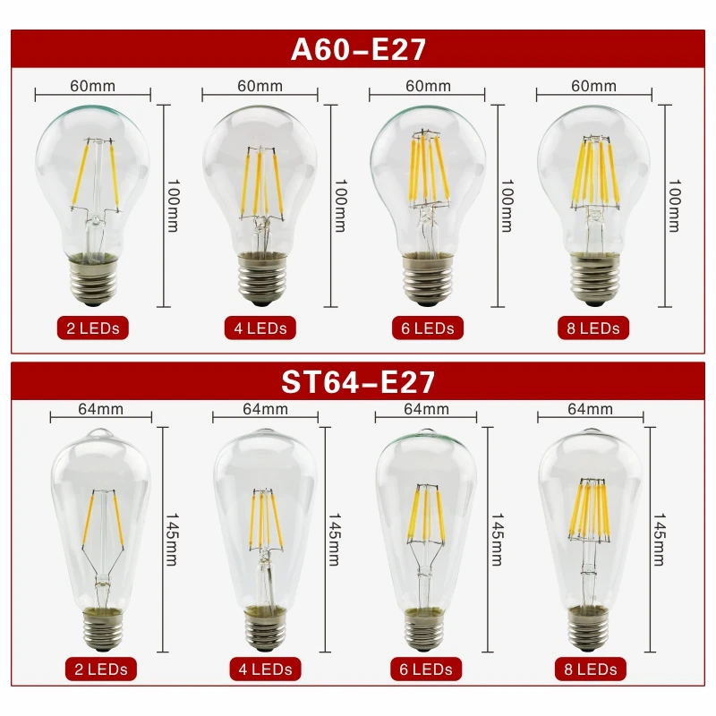 Светодиодная лампа Эдисона в стиле ретро, 6 шт.лот, E27, E14, 220-240 В переменного тока, C35, G45, A60, ST64, G80, G95, G125