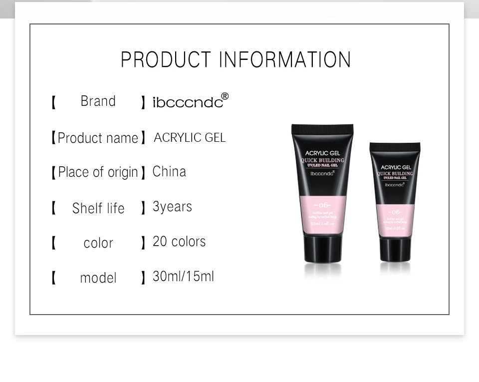 Посылка:Полигель для ногтей 20x30 мл1x10 мл Базовое покрытие1 х 10 мл верхнее покрытие1x45 мл раствор для скольжения1 х Радужная пилка1 х Кисть для ногтей с двойной головкой1x100 шт. Типсы для ногтей1x6 Вт usb мини-Сушилка для ногтей2 зажима для ногтей