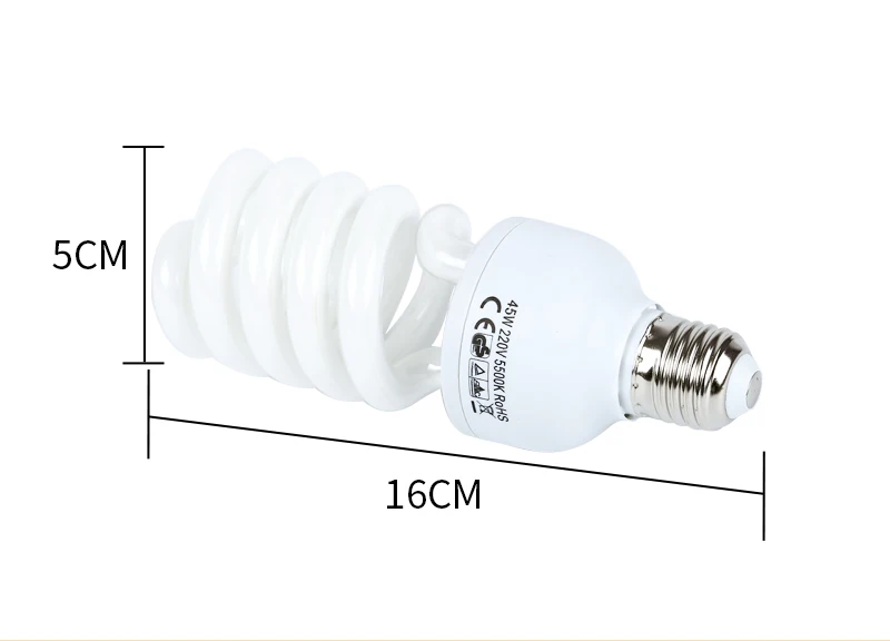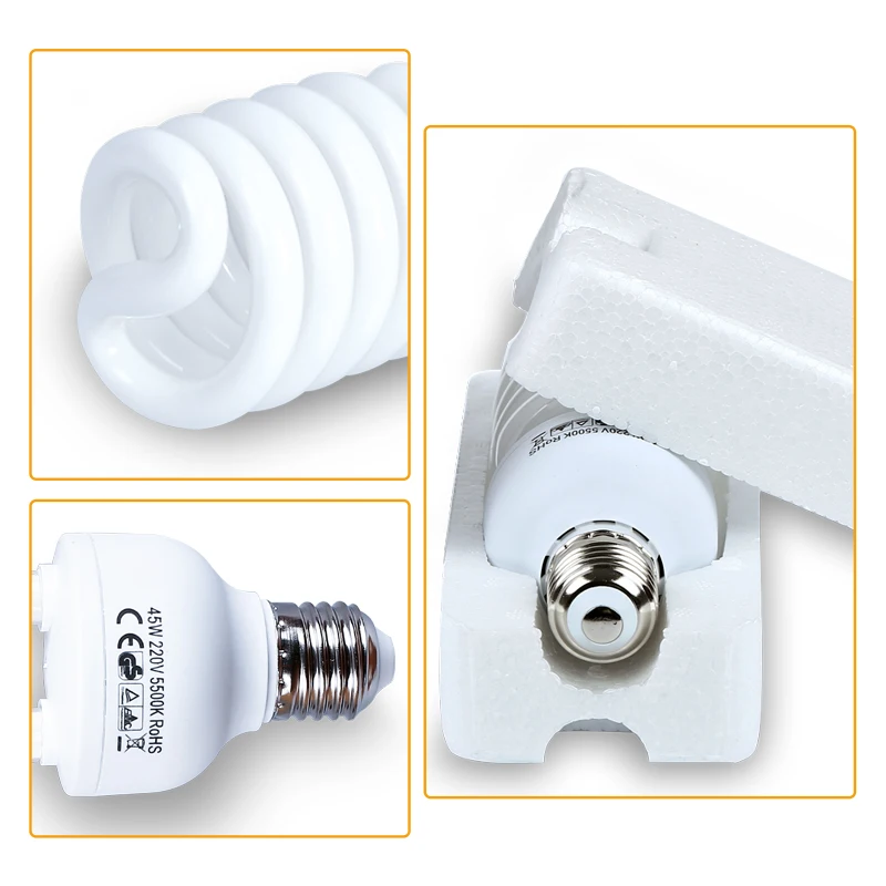 Лампа дневного света, 5500K обеспечивает истинные и точные цвета для большинства видео и фотостудий.Без шума, без мерцания, подходит для студийное освещение для фотографии, получить лучшие фотографические эффекты.E27 Scoket костюм для большинства стандартных фотографического оборудования.Нежный и светильник, легко носить с собой.