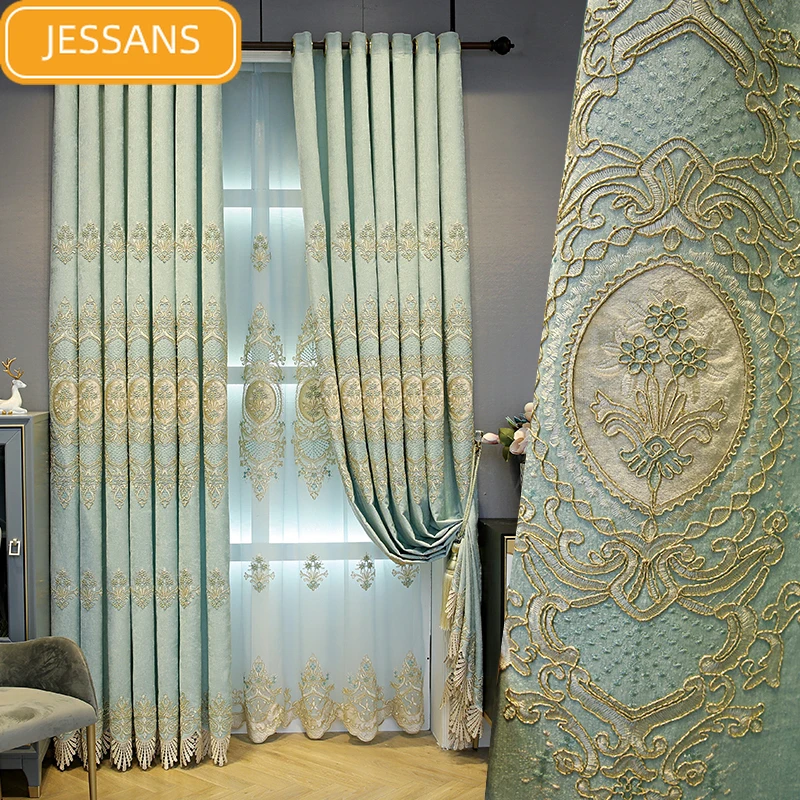 Европейские высококачественные шенильные зеленые шторы с вышивкой д...