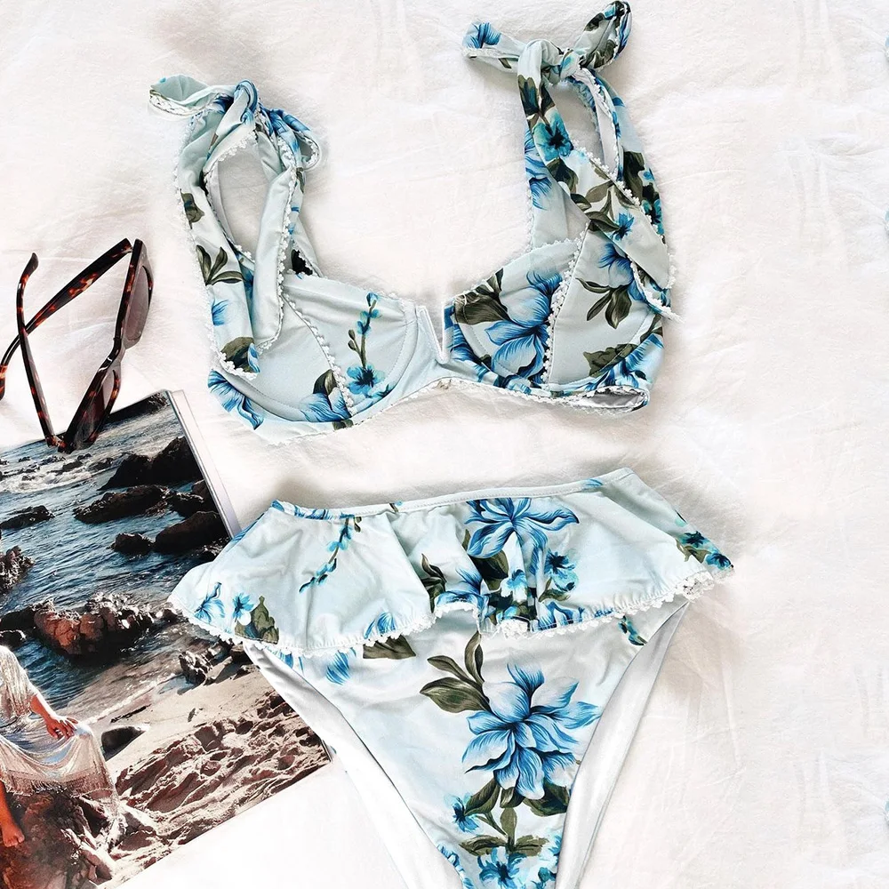 Купальник-бикини с цветочным принтом и оборками, с заниженной талией