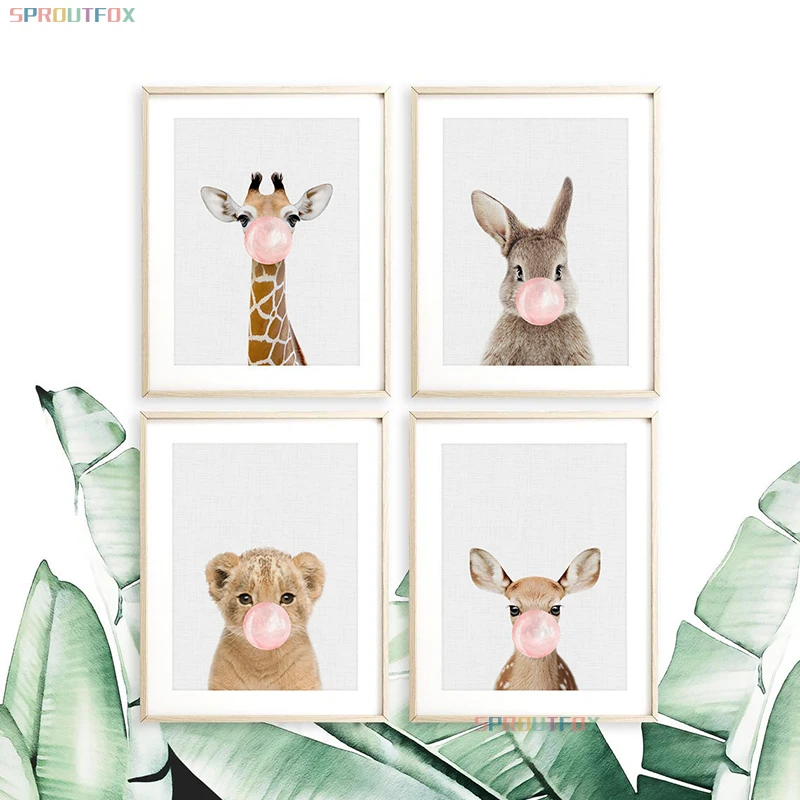 Kawaii розовый жевательной резинки животных ребенок плакат для детской жираф слон холст печати настенная живопись Nordic детская Декор