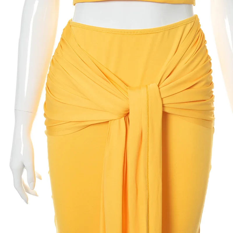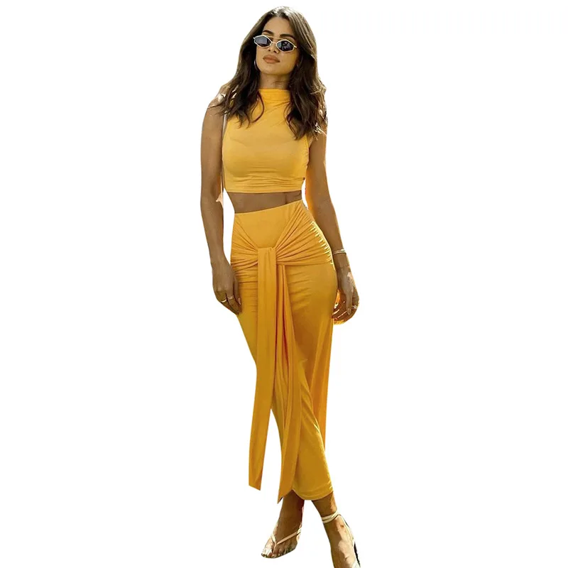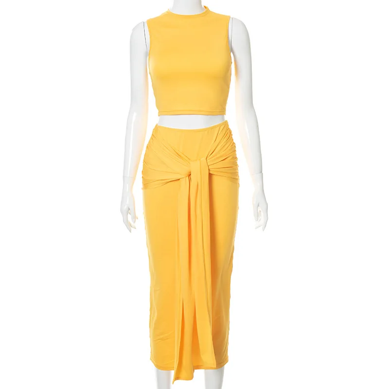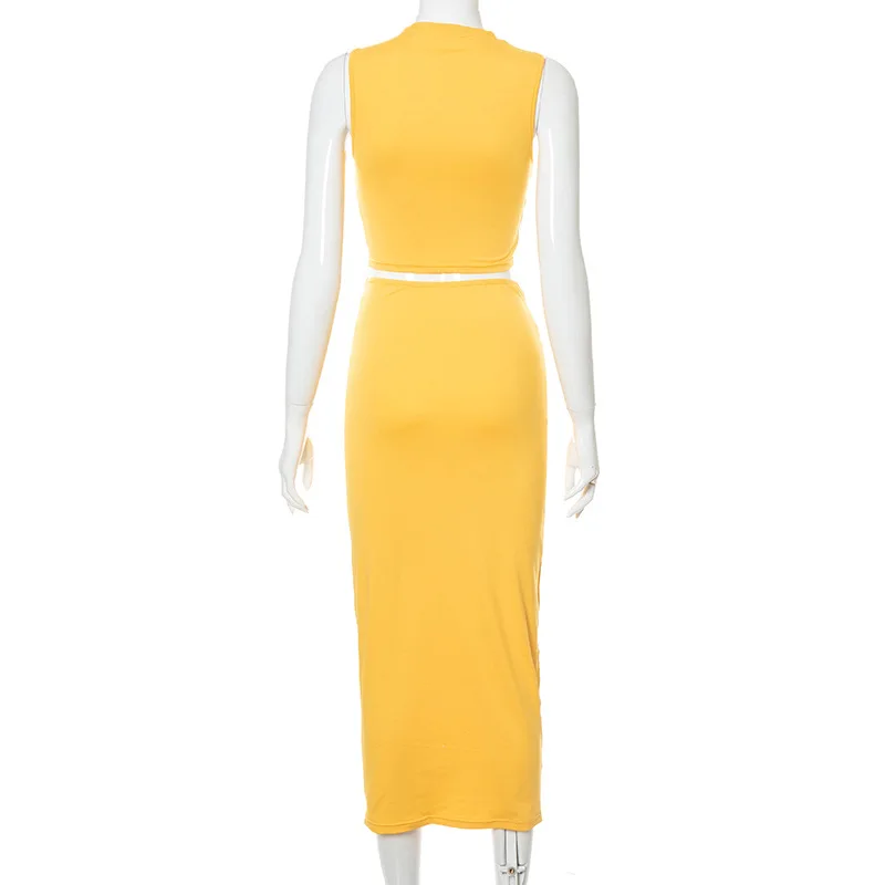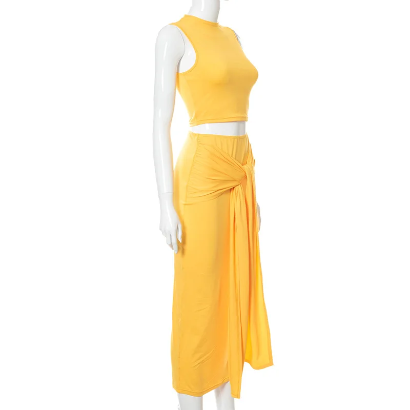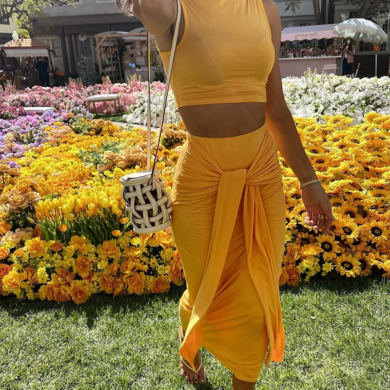 Женский повседневный комплект из двух предметов, желтый топ без рукавов и длинная юбка, летний комплект для отпуска