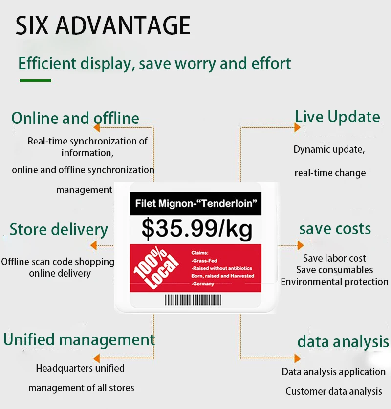 1. Магазин/супермаркет/школа/больничные партнеры не должны физически переценить этикетки2. Есть точные цены по всем каналам (в магазине и онлайн)3. Реагирует на тенденции и делает Управление рекламой магазина на пальцах4. Использовать успех Omni channel Strategy5. Примечание: теперь версия Bluetooth поддерживает только телефоны Andriod