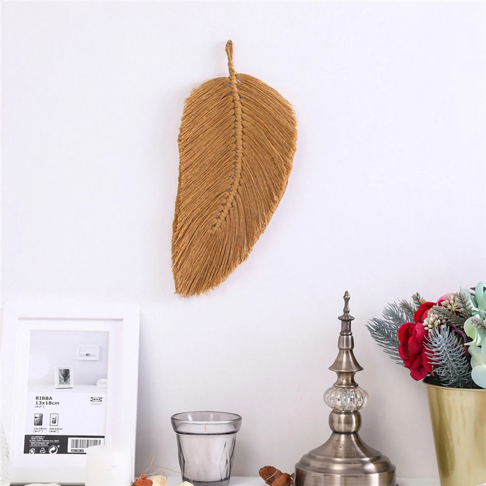 Гобелен ручной работы с листьями и перьями, хлопковый шнур, украшение в скандинавском стиле для комнаты, Настенный декор, макраме, кисточки для гостиной