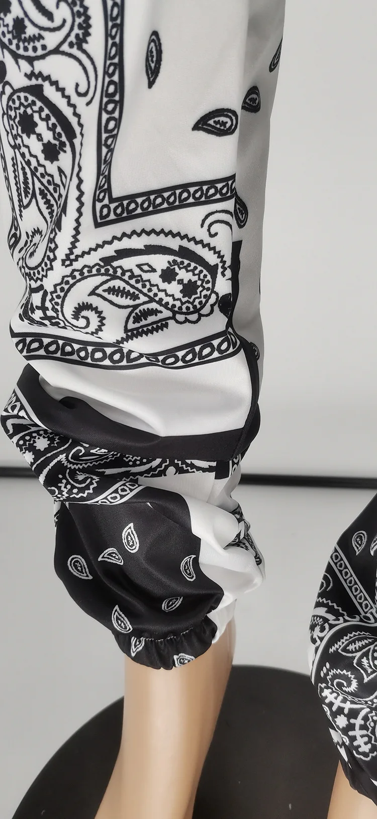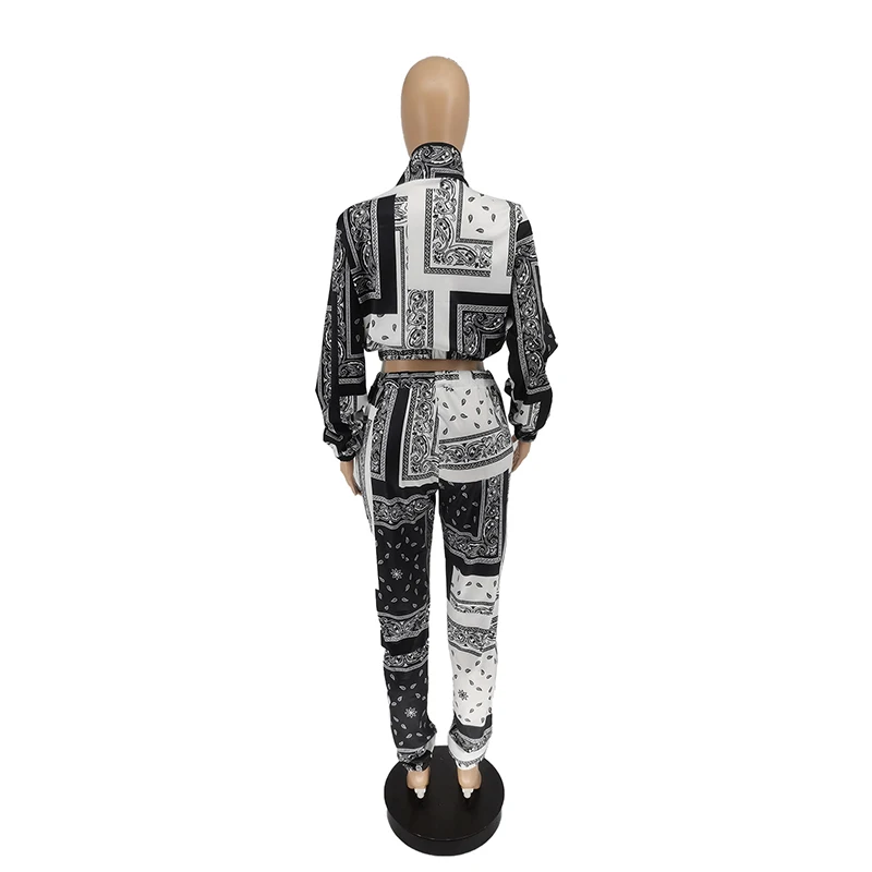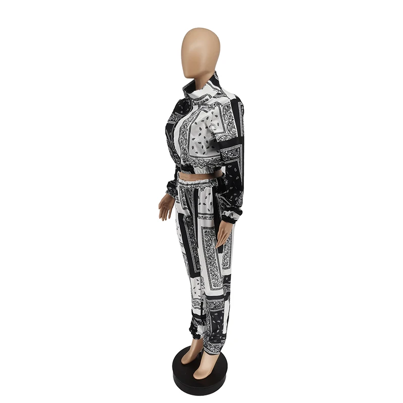 Женский Повседневный комплект из двух предметов, бандана с принтом пейсли и длинными рукавами, короткий жакет на молнии, топы, штаны для бега, одежда для улицы