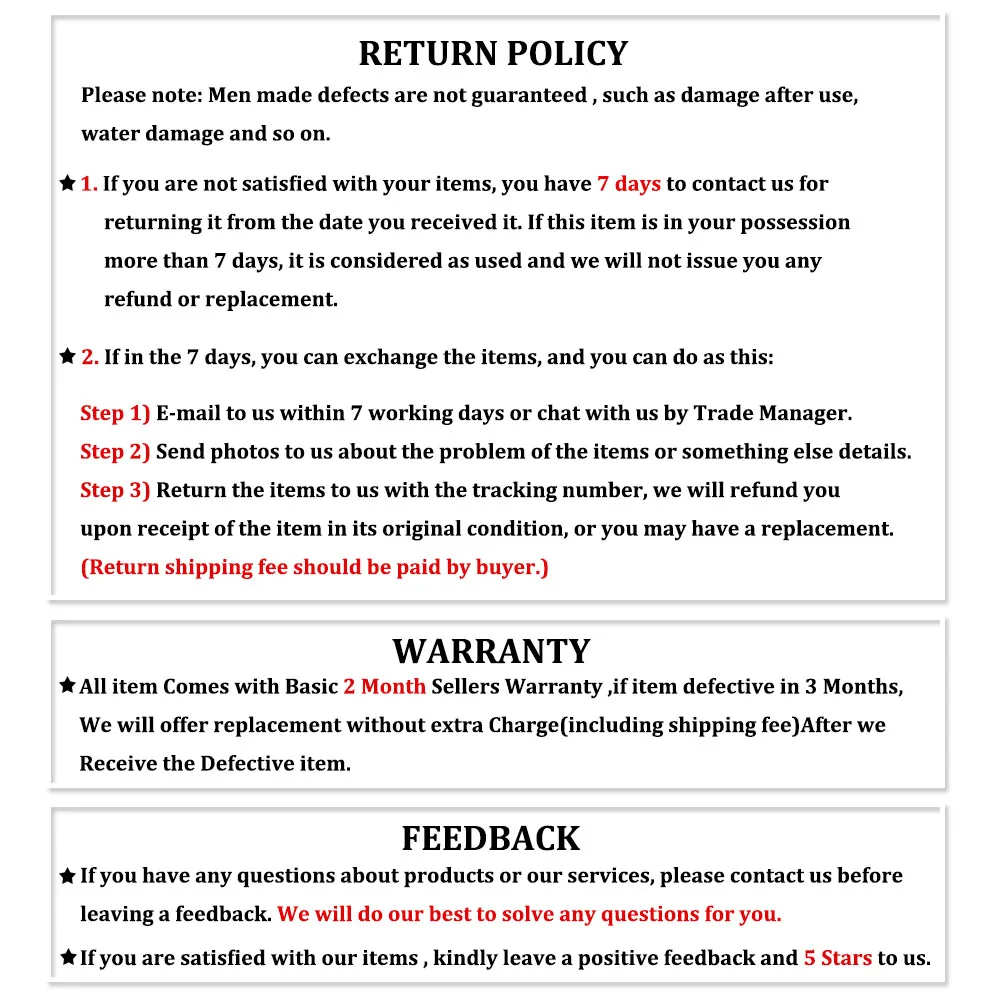 100% счастливое обслуживание: 1.В связи с неточной передачей цвета на экране монитора фактический цвет товара может немного отличаться от цвета на изображении. 2.Пожалуйста, учитывайте разницу в 1-5 мм из-за ручного измерения. Если у вас есть какие-либо вопросы, пожалуйста, свяжитесь с нами вовремя.