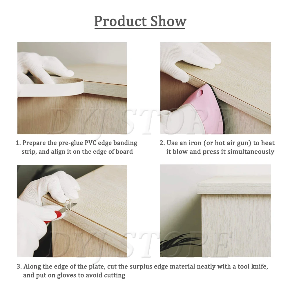 Простая установка и гибкость: Облицовочная кромка очень проста в установке. Используя обычный Утюг, Нагнетатель горячего воздуха или Кромкооблицовочный станок для глажки поверхности кромки шпона, чтобы ускорить плавление клея горячего расплава и сделать его быстро прилипающим к вашей мебели; кроме того, вы также можете легко обрезать ленту в соответствии с вашими потребностями.