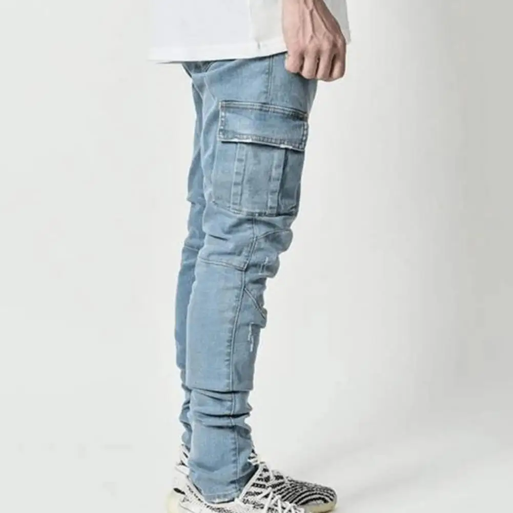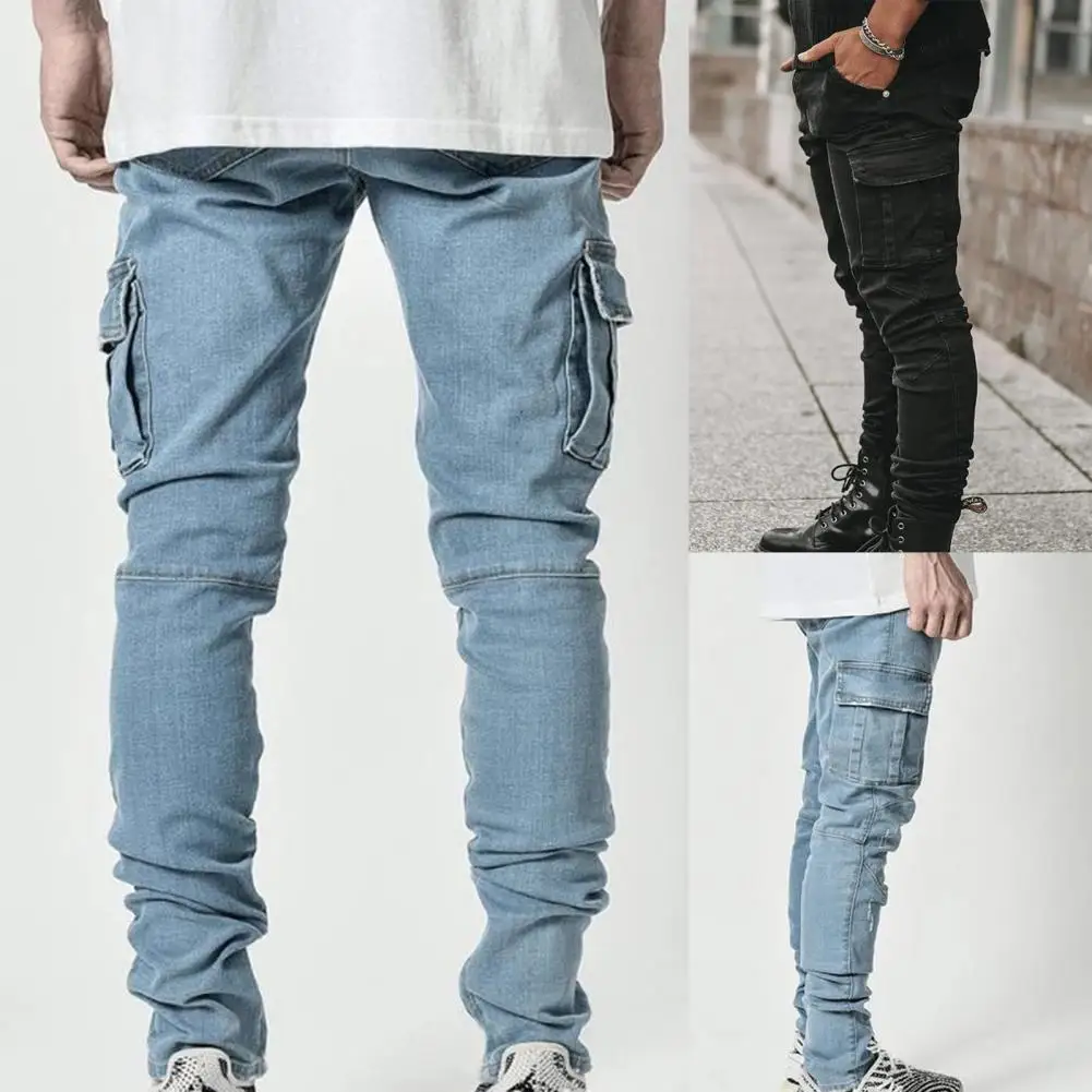 Мужские джинсовые брюки, повседневные однотонные облегающие модные мужские джинсы со средней талией и несколькими карманами, Эластичные Обтягивающие джинсы, мужские джинсовые брюки