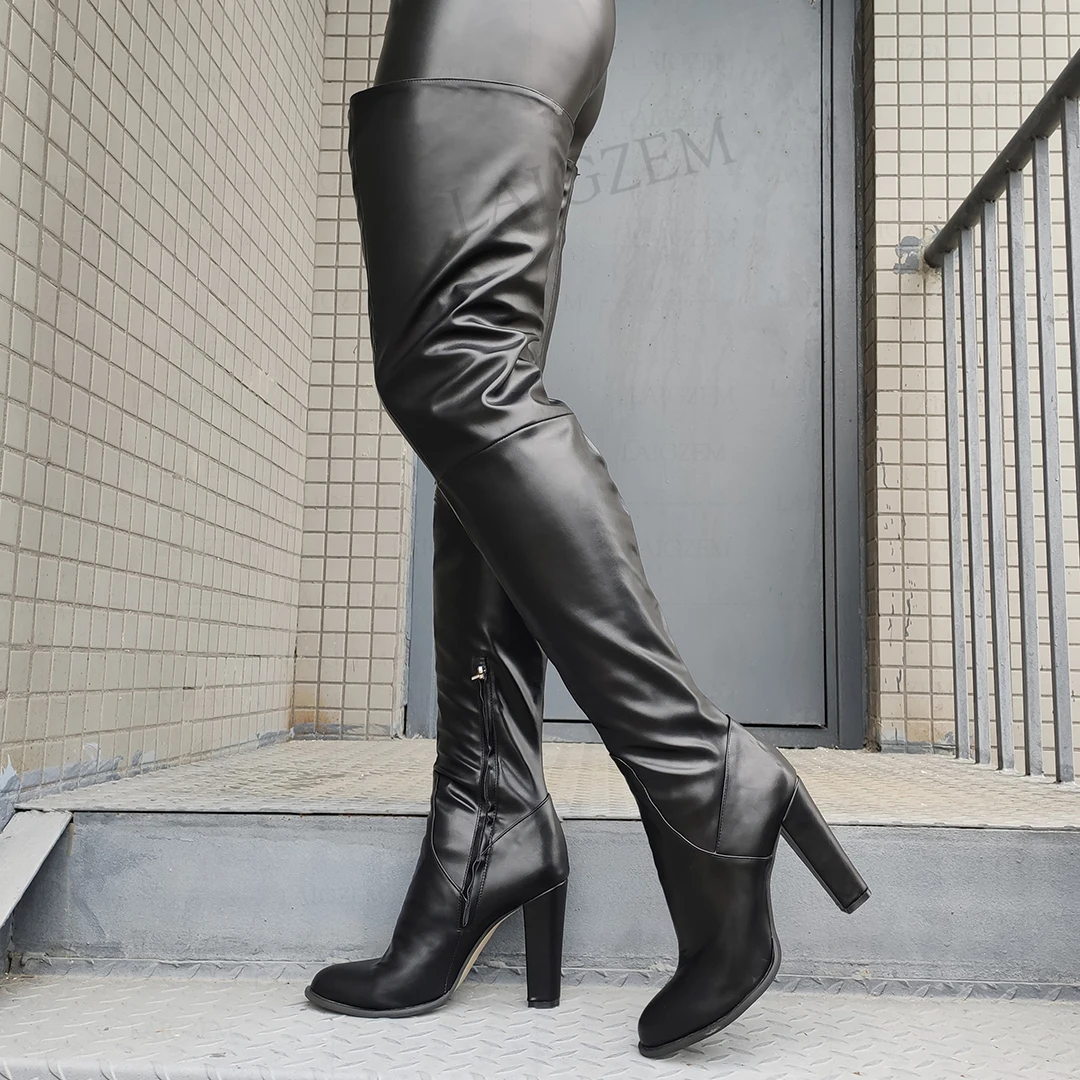 LAIGZEM/женские облегающие высокие сапоги; Круглый носок; Толстый толстый каблук; Боковая молния; Frauen Stiefel; Искусственная кожа; Женская обувь; Большие размеры 40, 47, 52
