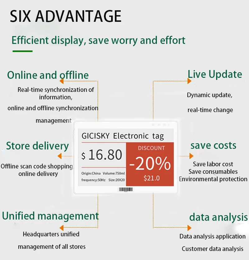 1. Магазин/супермаркет/школа/больничные партнеры не должны физически переценить этикетки2. Есть точные цены по всем каналам (в магазине и онлайн)3. Реагирует на тенденции и делает Управление рекламой магазина на пальцах4. Использовать успех Omni channel Strategy5. Примечание: теперь версия Bluetooth поддерживает только телефоны Andriod