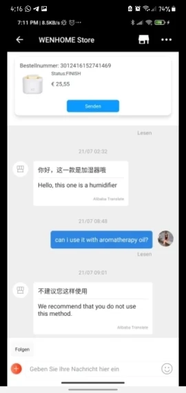 Мой увлажнитель сломался, несколько раз пробовал связаться с компанией, и они ответили в кратчайшие сроки. После открытия спора, они ответили мне один раз и никогда. Общение отсутствует, не уважается! Откройте спор, и они предлагают вернуть цену продукта (без перевозки) до тех пор, пока я отправлю товар обратно (оплачивая перевозку). Откройте спор, мои деньги вернули все, но я не указывал этот магазин ни для кого!