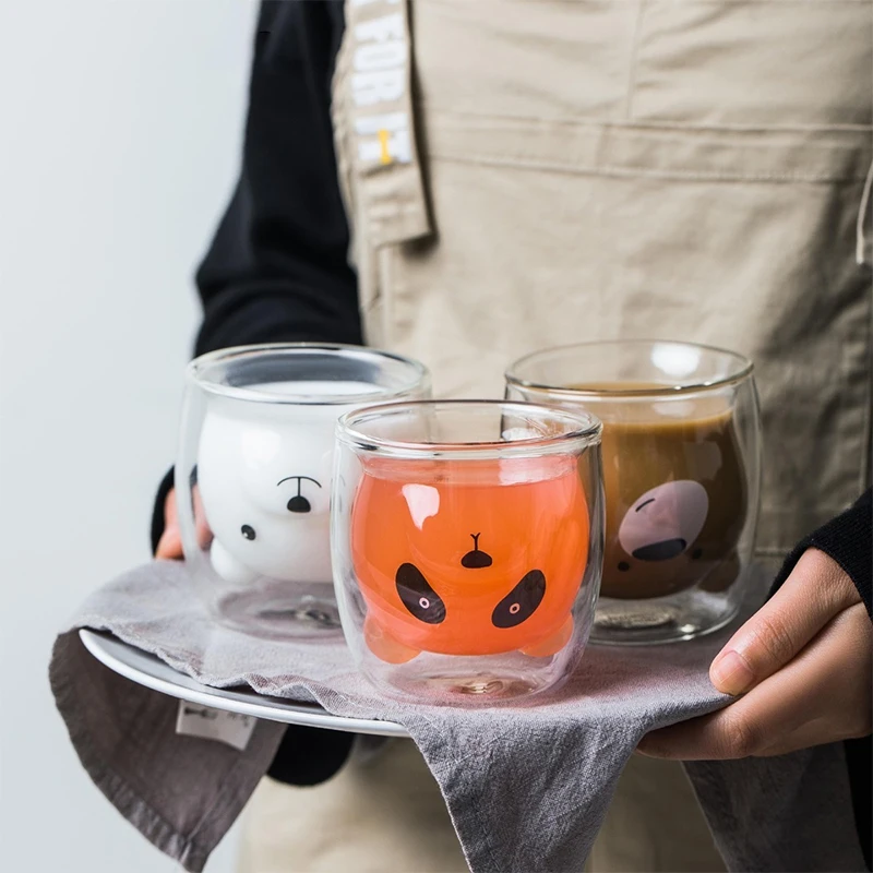 Стеклянная чашка с двойными стенками, чашка для кофе, сока, чая, завтрака, молока, кружка с милым медведем, пандой, кошкой, поросенком, Детская милая посуда для напитков, креативный подарок