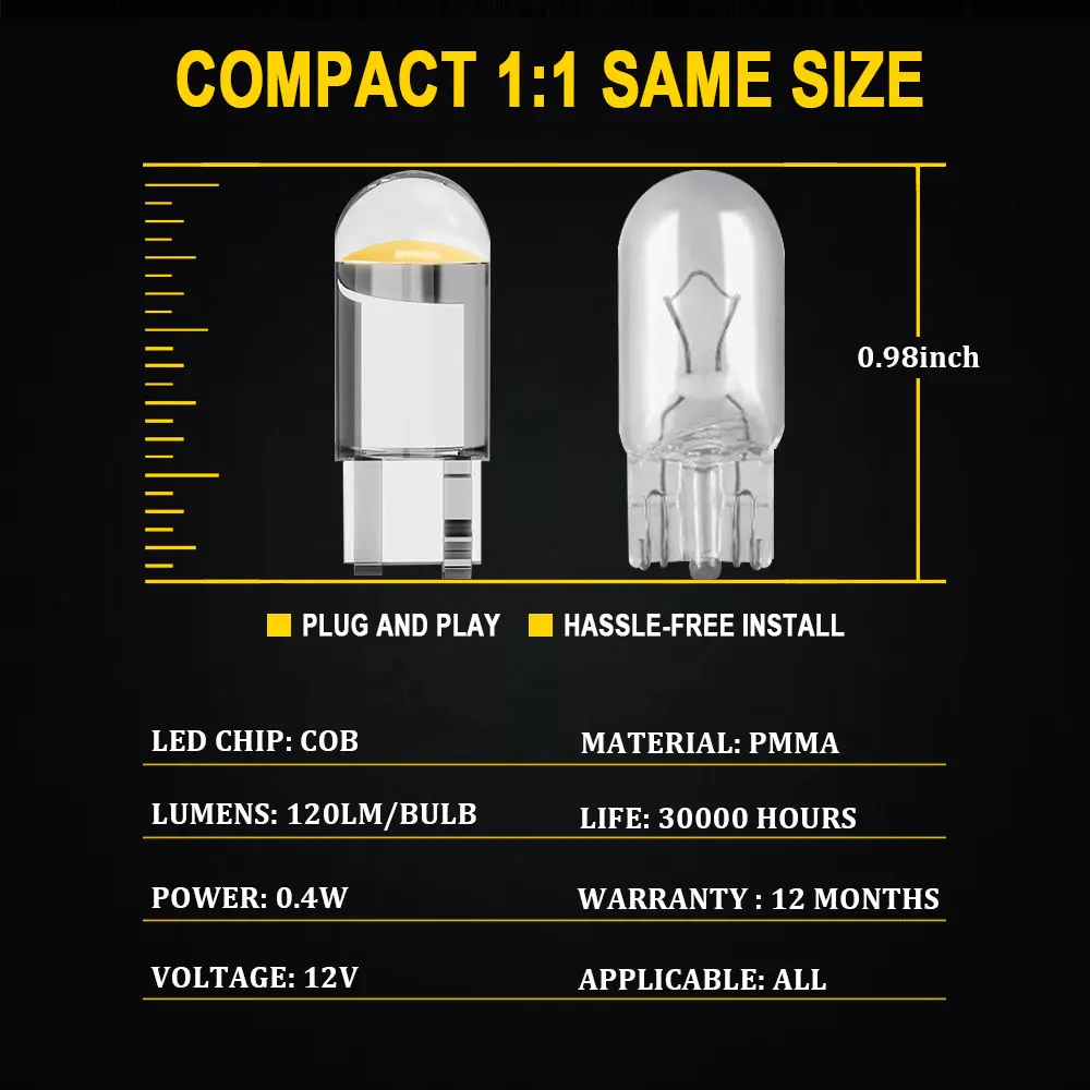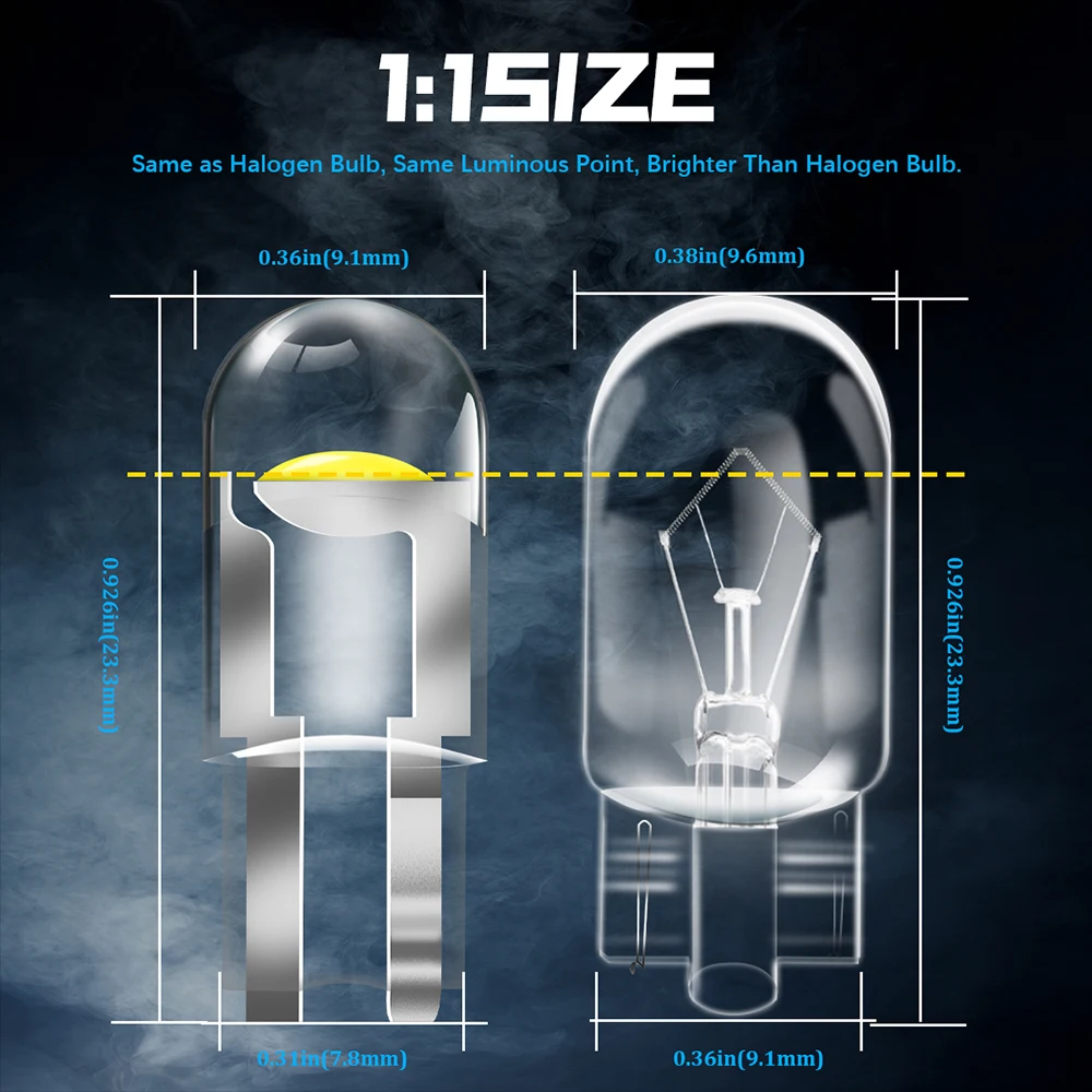 Светодиодный светильник w5w имеет 1:1 же размер, что и оригинальная галогенная лампа для 100% беспроблемной установки.Все-в-одном Оптический корпус ПК обеспечивает даже светильник без каких-либо теней.Доступны различные цвета, которые дополняют ваши варианты, чтобы добавить новый вид к вашим транспортным средствам.